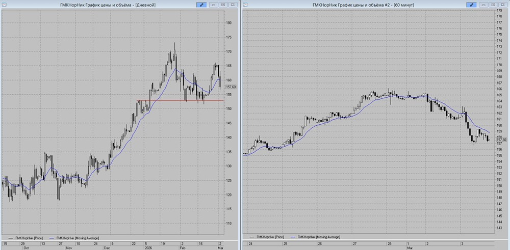 ГМК до конца недели рискует вновь протестировать линию дневного уровня поддержки около цены 153 руб. Конкретно в среду жду движения к цене 155 руб., которая выступает ближайшей целью.