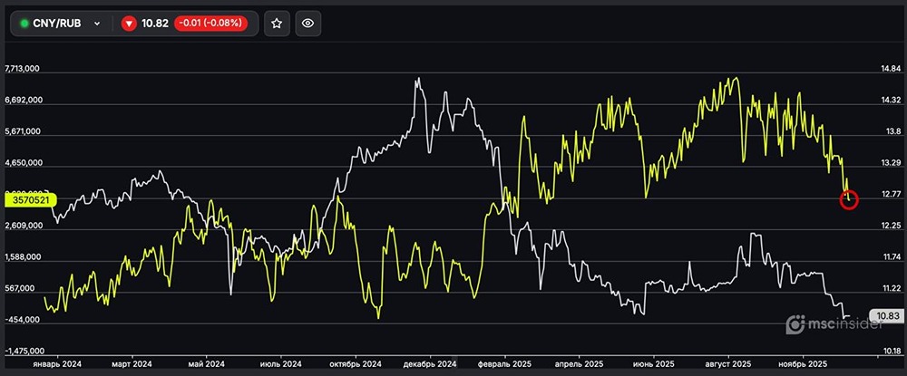 CNY/RUB: физлица продолжают активно сокращать чистый лонг.