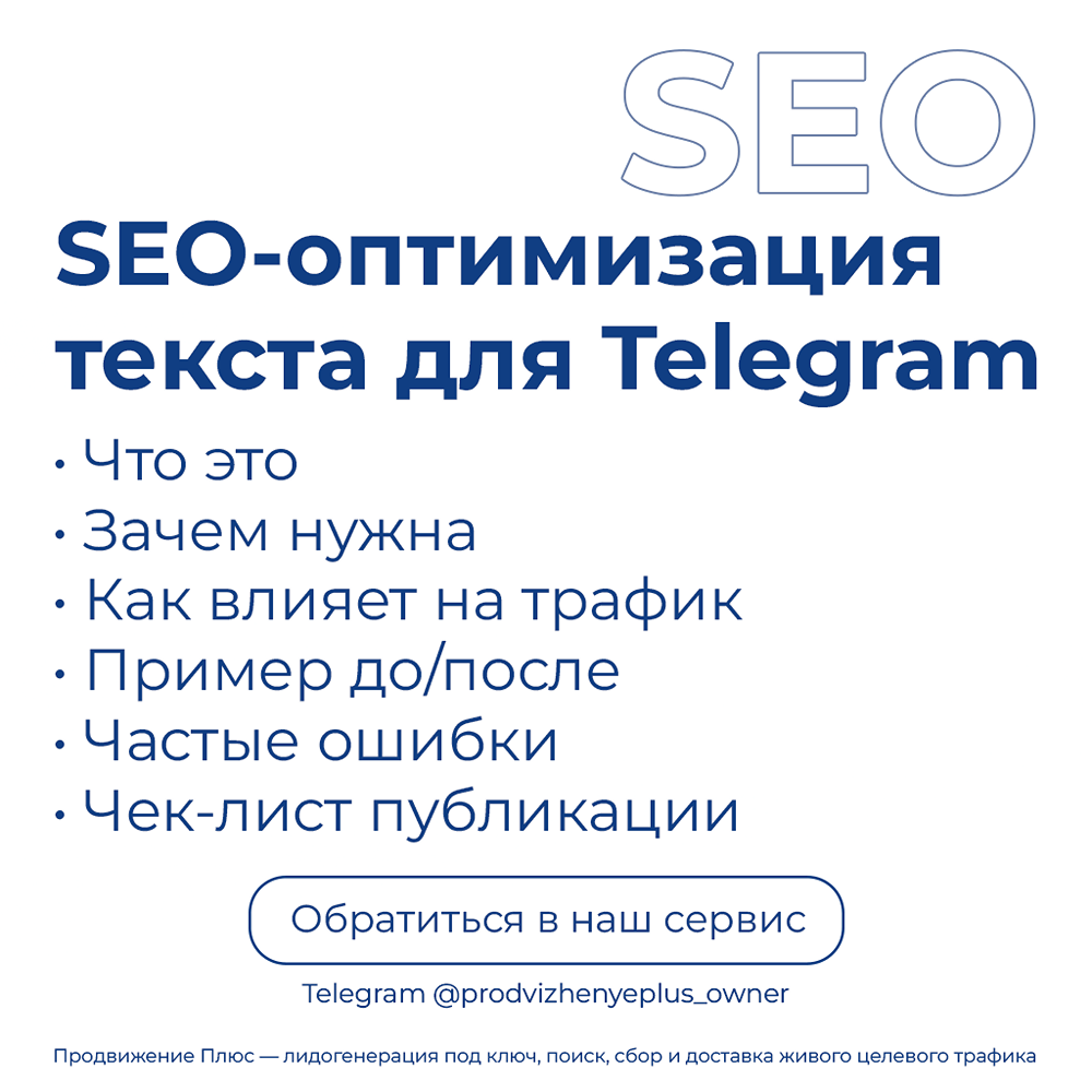 Разбираемся : Что это и зачем нужна SEO-оптимизация текста для Telegram ❔ Что это Подготовка поста под реальные запросы и поведение читателя: ключевая фраза в первой строке, ясная структура, синонимы, ответы на типовые вопросы, релевантные хэштеги и чёткий CTA. 📈 Зачем нужна — повышает видимость в поиске Telegram; — увеличивает дочитывания и CTR; — снимает возражения прямо в ленте; — ведёт к больше заявок из поста/профиля. 📇 Как влияет на трафик • больше показов по запросам → больше переходов в профиль/мессенджер; • выше удержание (короткие блоки, списки) → больше кликов по CTA; • релевантные теги → дополнительный бесплатный охват. 🗣 Пример «до/после» (один и тот же текст) До (сырое) «Ремонтируем ноутбуки. Быстро, недорого. Пишите в личку.» После (оптимизировано) Ремонт ноутбуков на дому в Москве — диагностика за 15 минут Зависает или шумит кулер? Поможем сегодня. • Что делаем: замена SSD/клавиатуры, чистка от пыли, установка Windows. • Сроки: выезд в день заявки, большинство работ — в тот же день. • Гарантия: до 6 месяцев. Заказать: пришлите модель/фото — ответим за 2–3 минуты. #ремонтноутбуков #Москва #мастернавыезд #сервис ❌ Частые ошибки — «набивка» ключей и канцелярит; — длинные абзацы без структуры; — нет локализации (город/ниша); — CTA непонятен или спрятан; — нерелевантные теги/их слишком много; — нет пользы: ни выгод, ни ответов на вопросы. ✅ Чек-лист публикации Первая строка = ключ + выгода. Ключ 1–2 раза по тексту естественно встроены в текст. Короткие абзацы/списки, подзаголовки. Ответы на 2–3 типовых вопроса. Чёткий CTA. 3–5 хэштегов от общего к частному. 👨💻Нужна такая же оптимизация ваших постов? [Продвижение Плюс](https://t.me/prodvizhenyeplus) — Сделаем подбор запросов, перепишем тексты и поднимем конверсию. Tg Владелец проекта : @prodvizhenyeplus_owner Tg direct : [Написать](https://t.me/prodvizhenyeplus?direct) #SEO #копирайтинг #TelegramМаркетинг #лидогенерация #ПродвижениеПлюс Источник: https://t.me/prodvizhenyeplus