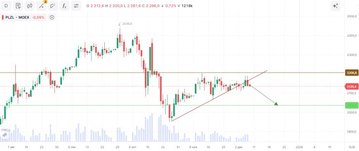 Цена пробила ключевую линию поддержки восходящего тренда и закрепилась ниже неё. Это признак завершения бычьего импульса и вероятного дальнейшего снижения. При позиции в 6% и стоп-заявке на уровне 2206,8 рублей риск для портфеля составит 0,2%. Отношение прибыли к риску — 1,39.