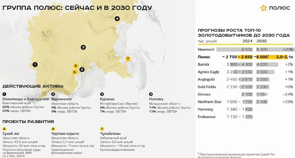 Полюс: перспективы роста в золотодобывающей отрасли «Полюс» — крупнейший производитель золота в России и один из десяти ведущих в мире. Компания известна своей эффективностью и уникальной ресурсной базой. Себестоимость «Полюса» остаётся одной из самых низких в мире, но расходы растут. В первом полугодии 2025 года TCC увеличилась до 653 долларов, что вдвое больше, чем годом ранее. Это связано с уменьшением содержания золота в руде и инфляцией. ПРОИЗВОДСТВО ПОЛЮСА НЕ РАСТЁТ После пика в 2019 году добыча компании стабилизировалась. В 2023 и 2024 годах было произведено около 2,9–3,0 млн унций золота, а прогноз на 2025 год — около 2,55 млн унций. Руководство компании не ожидает значительного роста добычи до 2027 года. Ключевой фактор себестоимости в золотодобыче — содержание золота в руде. С 2017 года этот показатель у «Полюса» снижается. В первом полугодии 2025 года он упал до 1,2 г/т по сравнению с 1,76 годом ранее. Компания перерабатывает самые богатые руды, но не вся добытая руда идёт в переработку. «Олимпиада» — главный актив компании «Олимпиада» обеспечивает около половины добычи «Полюса». У компании есть и другие перспективные проекты, которые помогут компенсировать снижение содержания золота на текущих активах. Сухой Лог — крупнейший неосвоенный проект Сухой Лог — крупнейший золотой проект в отрасли с запасами 43,5 млн унций. При производительности 34 млн тонн руды в год и ожидаемом среднем производстве 2,3–2,8 млн унций, этот проект сопоставим с текущей добычей всей группы. Средние содержания золота на Сухо Логе выше, чем на «Олимпиаде». Формально проект способен увеличить добычу группы более чем на 70%, но на практике прирост будет ниже из-за старения «Олимпиады». Добыча уже ведётся, но выход на проектную мощность ожидается после 2030 года. CAPEX оценивается в 6 млрд долларов, а проект предусматривает льготы по НДПИ и налогу на прибыль. Чульбаткан и Чёртово корыто — дополнительные точки роста У компании есть ещё два проекта меньшего масштаба — Чульбаткан и Чёртово корыто. Каждый из них даст около 0,3 млн унций золота в год и потребует CAPEX в размере 0,6–1,0 млрд долларов. Ожидаемый ввод в эксплуатацию — 2029–2030 годы. Потенциал роста при текущих ценах на золото При цене золота около 5000 долларов за унцию выручка «Полюса» в 2026 году может превысить 1,2 трлн рублей, а оценка P/E составит около 6–7. Текущие цены золота уже заложены в стоимость компании, но проекты роста ещё не реализованы. Если «Полюс» сможет достичь целевого уровня добычи в 6 млн унций золота к 2030 году, это будет означать двукратный рост производства. Однако запуск Сухого Лога откладывается уже несколько лет, поэтому на него пока нельзя рассчитывать. Неопределённости На перспективы компании влияют цены на золото, возможные задержки проектов, снижение добычи на текущих месторождениях и рост себестоимости. Не является индивидуальной инвестиционной рекомендацией Пост взят с международного сервиса для инвесторов и трейдеров [M O N D I A R A](https://i.mondiara.com/) 👉 вот ссылка на канал: https://i.mondiara.com/i/c/polyus_analytics Скачать приложение в [App Store](https://apps.apple.com/ru/app/m-o-n-d-i-a-r-a/id6475953453) Скачать приложение в [Google Play](https://play.google.com/store/apps/details?id=com.mondiara.app) Валюта расчёта - Ваши добрые мысли! Спасибо, что с нами! [M O N D I A R A](https://i.mondiara.com/) — ключевой инструмент для исследований, торговли, инвестирования и стратегического планирования на российск