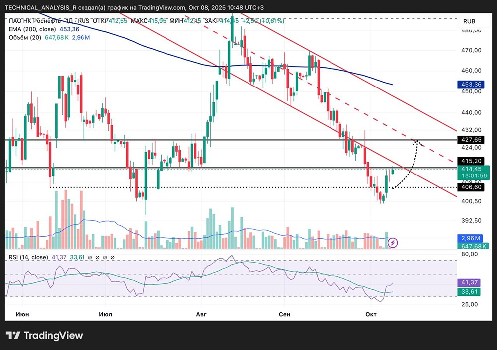 Если актив удержится выше этой отметки, появится шанс движения к верхней зоне боковика - 426-428, где ранее проходили продажи. RSI вышел из перепроданности и показывает признаки восстановления, что подтверждает вероятность дальнейшего роста.