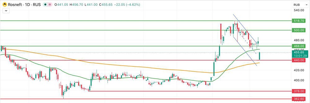Сегодня акции Роснефти уже сумели отыграть существенную часть утренней просадки. Теперь они могут перейти в состояние волатильной консолидации в диапазоне 440–468 руб. Среднесрочные перспективы теперь выглядят нейтрально. Стимулом для заметного сдвига от текущего уровня может стать очередной скачок цен на нефть.