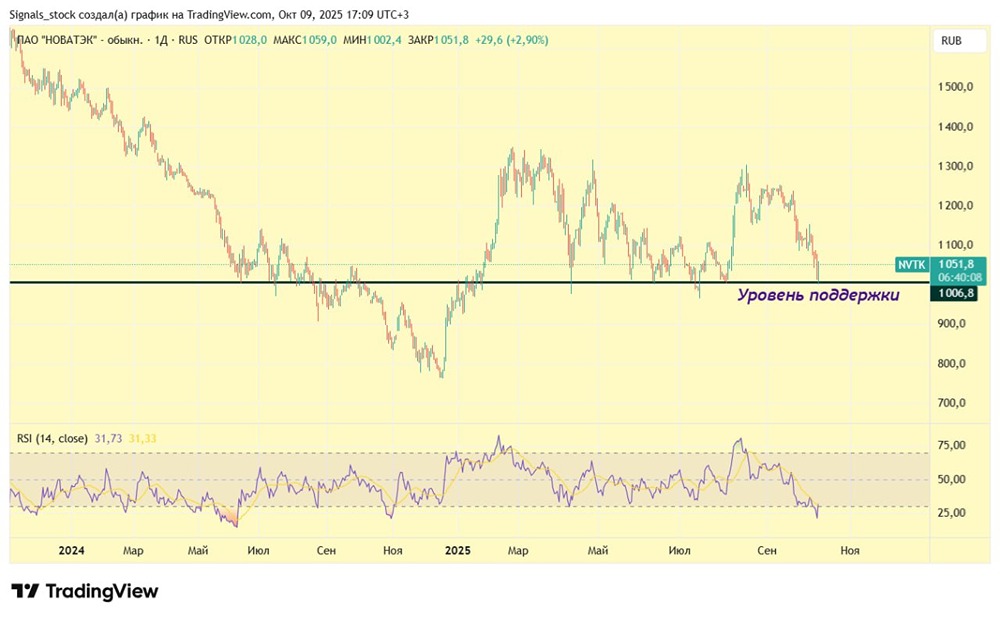 Снова в центре внимания Вернемся к техническим аспектам: акции достигли важного уровня поддержки — круглой цены 1000 рублей. Этот уровень фактически является минимумом года. А учитывая, что мы впервые с конца 2024 года вошли в зону перепроданности, можно ожидать технического отскока. Что касается фундаментальных показателей, я уже упоминал, что шесть танкеров доставили партию СПГ из проекта «Арктик СПГ-2» в Китай. 2025 год, вероятно, станет рекордным по многим финансовым показателям, включая выручку и EBITDA. Можно представить, что будет, когда отгрузки с «Арктик СПГ-2» наберут обороты. Новатэк — это не только история мирного трека, но и крайне перспективный актив в условиях санкций. Его преимущество перед Газпромом заключается в отсутствии необходимости огромных капитальных затрат на прокладку труб. Что делать❓ Недавно я пополнил свою позицию, но увеличивать ее не буду. С текущих уровней можно смело покупать в среднесрочной перспективе, усреднять или брать спекулятивно со стоп-лоссом под недавние минимумы. Думаю, что с текущих уровней мы, скорее всего, направимся к максимумам этого года, в район 1250-1300 рублей. Данный материал носит информационный характер и не является индивидуальной инвестиционной рекомендацией или предложением о покупке или продаже указанной ценной бумаги. Больше новостей и анализа находятся в нашем мобильном приложение [m o n d i a r a](https://i.mondiara.com/) в канале: https://i.mondiara.com/i/c/novatek_analytics Скачать в [App Store](https://apps.apple.com/ru/app/m-o-n-d-i-a-r-a/id6475953453) Скачать в [Google Play](https://play.google.com/store/apps/details?id=com.mondiara.app) Источник: Сигналы для торговли