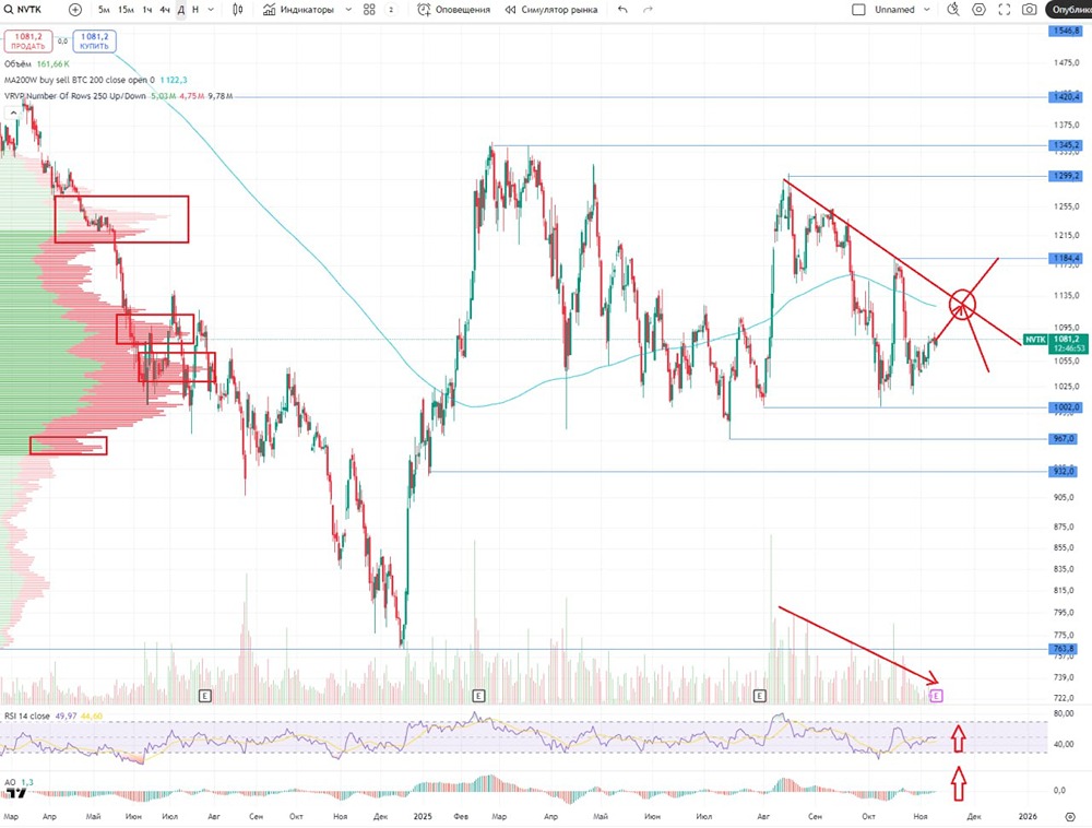Стоит ли покупать Новатэк на уровне 1076 рублей сейчас? Аналитика компании Сектор: энергетика, газ Последний анализ компании Новатэк был проведен 7 сентября. Тогда акции стоили 1243 рубля, и я ожидал их роста до 1350 рублей. Однако за две недели акции почти не изменились, а затем, на фоне ухудшения переговоров между США, Россией и Украиной, начали падать. В моменте цена опускалась до 1000 рублей. Прошлый прогноз не оправдался. Сейчас акции торгуются по 1076 рублей. Давайте рассмотрим последние новости, график и перспективы компании. Основные метрики - Капитализация: 40,1 миллиарда долларов. - P/E: 8,65. - P/S: 2,04. - P/B: 1,1. - EPS: 124,33 рубля. - EBITDA: 998,7 миллиарда рублей. - EV/EBITDA: 3,38. По сравнению с прошлым обзором, компания оценивается чуть дешевле. Отчета за третий квартал 2024 года еще нет. Новостной фон - Экспорт СПГ: в октябре он вырос на 21% благодаря запуску проекта «Арктик СПГ-2». Это привело к рекордным показателям, как сообщает LSEG. - Добыча углеводородов: в третьем квартале она составила 161,4 миллиона баррелей нефтяного эквивалента, включая 20,13 миллиарда кубометров природного газа и 3,52 миллиона тонн жидких углеводородов. - Сравнение с прошлым годом: добыча уменьшилась на 2 миллиона баррелей или 1,2% по сравнению с третьим кварталом 2023 года. - Завод «Арктик СПГ-2»: несмотря на санкции, в сентябре он увеличил добычу газа до рекордного уровня из-за высокого спроса со стороны Китая, по данным BBG. - Южная Корея: в августе удвоила импорт СПГ из России, став третьим крупнейшим покупателем после Японии и Китая, по данным таможни. Финансовое здоровье - Собственный капитал: за первое полугодие 2025 года он вырос на 4%. - Чистый долг: снизился на 23%. - Net Debt / EBITDA: 0,11, что указывает на минимальную долговую нагрузку. Финансовое состояние компании отличное: капитал растет, долг сокращается. Выручка и прибыль - Выручка: за первое полугодие 2025 года она выросла на 3%. Темпы роста заметно снизились: в 2023 году они составляли 19%, а в 2024 году — 13%. - Прибыль: за первое полугодие 2025 года упала на 24%. Три предыдущих года прибыль росла. - Свободный денежный поток: за первое полугодие 2025 года вырос на 4%. Будущее и оценки - Прогнозы аналитиков: на 30 июля 2023 года Т-Инвестиции давали оценку 1620 рублей, ЦИФРА брокер — 1824 рубля, ПСБ — 1393 рубля. Основные акционеры - SWGI Growth Fund Linited: 14,4%. - ООО «Левит»: 7,3%. - Новатэк Эквити Лимитед: 1,3%. Сравнение с конкурентами Новатэк входит в тройку крупнейших компаний по капитализации в своем секторе. По финансовым метрикам компания оценивается чуть дороже сектора, но по долговой нагрузке и рентабельности она лучше конкурентов. В моем обзоре сектора Новатэк занял шестое место. Дивиденды В последние два года компания выплачивала около 6,5% годовых. Финансовое состояние позволяет продолжать выплаты без проблем. Обычно дивиденды выплачиваются два раза в год. Первая выплата запланирована на 25 апреля 2024 года в размере 46,65 рубля на акцию. В 2025 году компания уже выплатила 6,82% двумя выплатами. Технический анализ Объемы торгов снижаются, интерес к акциям падает. Индикаторы на дневном таймфрейме указывают на возможность отскока, но движение ограничено нисходящим трендом. По моему мнению, акции могут вырасти до 1120 рублей. Оттуда есть два варианта: либо цена пробивает нисходящее движение и идет к 1180 рублям, либо снова падает до 1000 рублей. Это отображено на графике. Выводы Судя по новостям и фундаментальн
