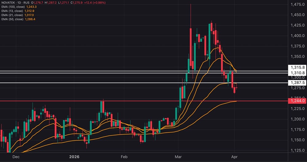 🔻 Акции НОВАТЭК отрабатывают коррекционный сценарий, уйдя ниже уровня ₽1290 и рискуя упасть еще ниже до следующей поддержки на ₽1245–1250.
