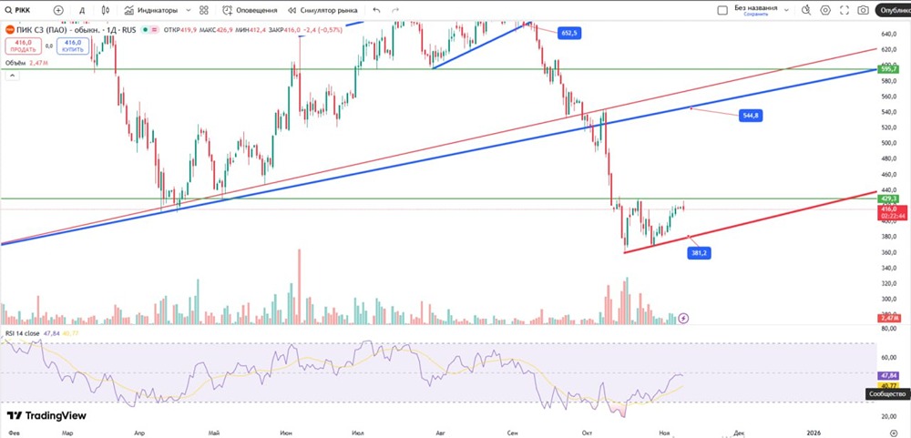 Для начала импульсного роста необходимо преодолеть верх боковика (выше 429), тогда цель сверху сместится на уровень трендовой синей линии (544).