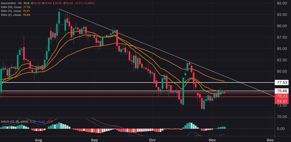 Если же его удастся пробить, тогда откроется путь для более сильного отскока до 50 ЕМА (₽77,5). Там же находится верхняя граница нисходящего канала.