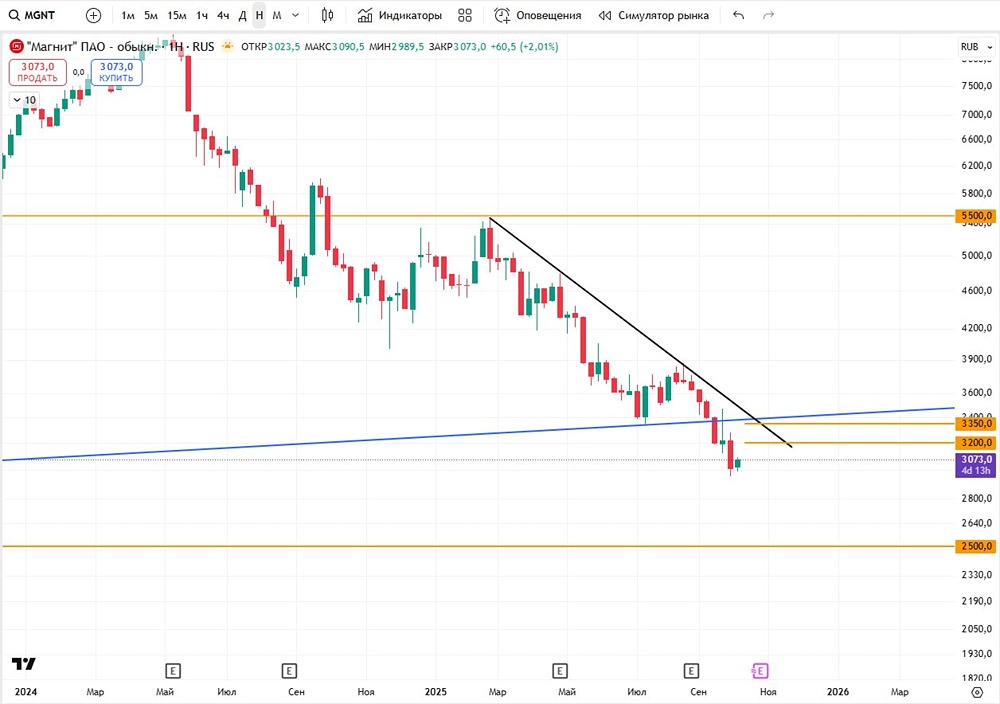 Локально можем увидеть отскок до уровня 3200/3350. На 3350 у нас будет касание локальной нисходящей трендовой (чёрная линия) и восходящей трендовой (синяя линия), которую мы пробили на месячном графике.