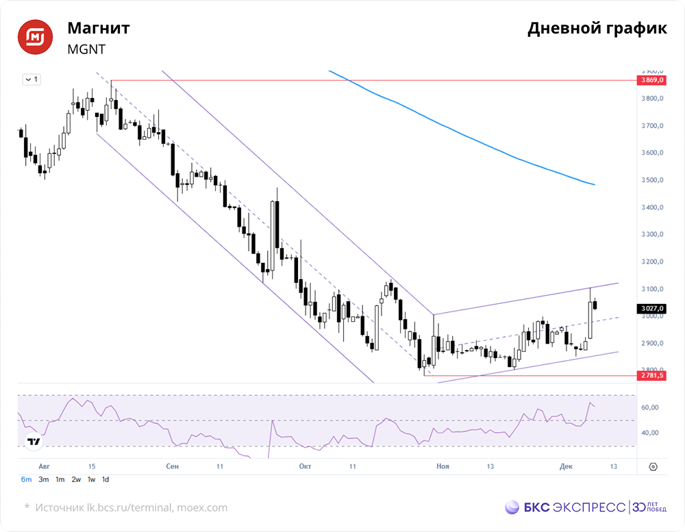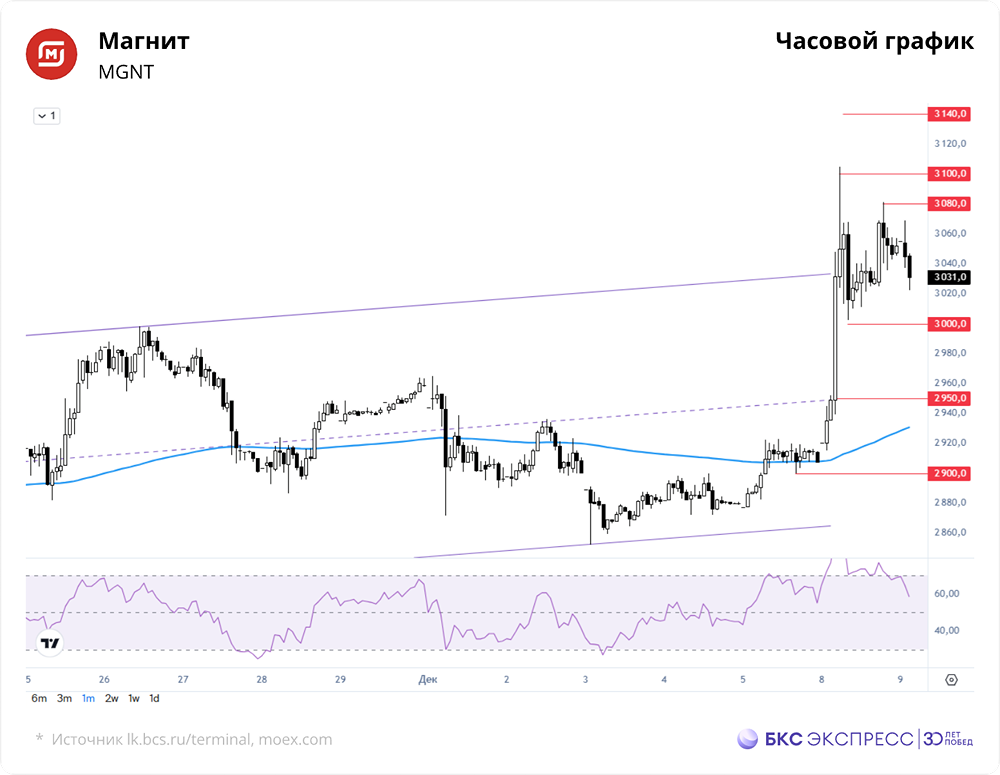 Мнение: БКС Экспресс Акции Магнита могут снова начать расти Вчера акции Магнита выросли на 4,99%, достигнув 3052 руб. Объем торгов достиг рекордного уровня за год и составил 10,5 млрд руб. Утром акции снизились на 0,88%, вернувшись к отметке 3025 руб. Краткосрочная перспектива • Резкий рост акций сопровождался увеличением торгового оборота. Всплеск интереса к бумагам торговой сети произошел без явных информационных причин. Спекуляции подогрела ошибочная новость на сайте Московской биржи. С точки зрения технического анализа, близость к трехлетнему минимуму создает благоприятные условия для открытия долгосрочных позиций. • Итоги дня показали позитивную техническую картину. Утреннее значение индекса относительной силы RSI указывает на то, что акции вышли из состояния перекупленности после вчерашнего роста. • Вчерашние покупки улучшили среднесрочную техническую картину. Акции Магнита могут продолжить рост после краткосрочной коррекции. Уровень 3100 руб. теперь выступает значимым сопротивлением. Внешний фон • Индекс S&P 500 снизился на 0,35%, а фьючерсы на него утром растут на 0,1%. Азиатские фондовые индексы показывают смешанную динамику. Нефть Brent подешевела на 0,3%, достигнув $62,3 за баррель. Уровни сопротивления: 3080 / 3100 / 3140 Уровни поддержки: 3000 / 2950 / 2900 Долгосрочная перспектива • К началу декабря акции Магнита остаются ниже 200-дневной средней. Однако недавний рост покупок может улучшить перспективы на ближайшие недели. • Акции находятся в нижней части многолетнего диапазона, и долгосрочная техническая картина остается негативной. • Прогноз на год предполагает рост акций Магнита до 4200 руб., что означает потенциальное увеличение стоимости на 39% от текущего уровня. Автор: Манжос Виталий Не является индивидуальной инвестиционной рекомендацией Пост взят с соцсети [M O N D I A R A](https://i.mondiara.com/) 👉 вот ссылка на канал: https://i.mondiara.com/i/c/magnit_analytics Скачать в [App Store](https://apps.apple.com/ru/app/m-o-n-d-i-a-r-a/id6475953453) Скачать в [Google Play](https://play.google.com/store/apps/details?id=com.mondiara.app) Валюта расчёта - Ваши добрые мысли! Спасибо, что с нами! Источник: bcs-express.ru