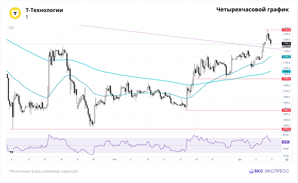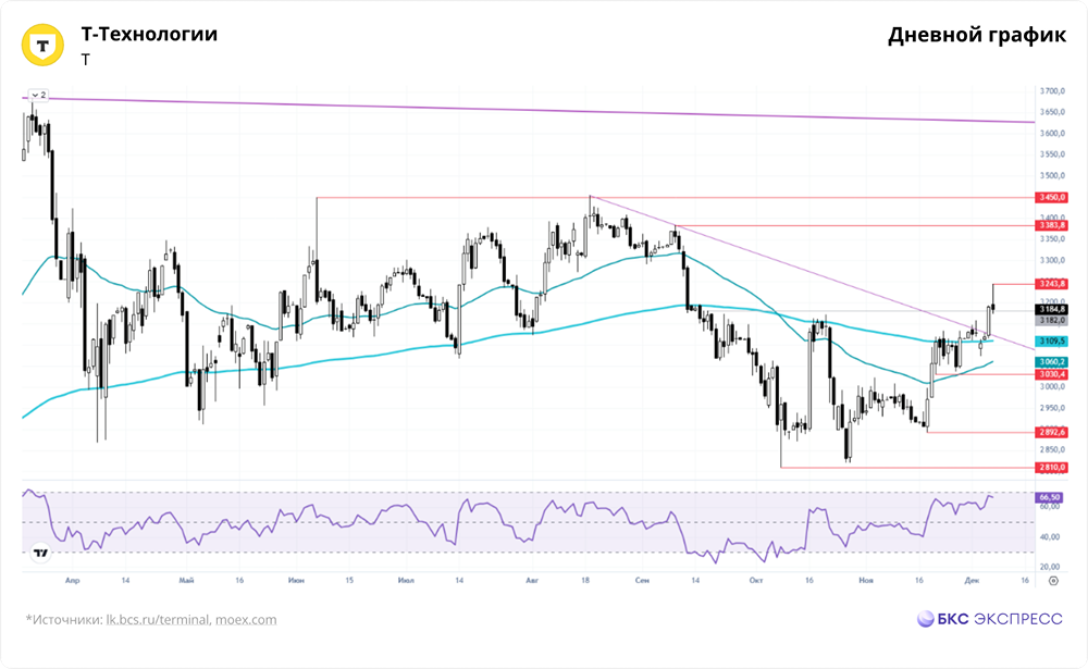 Мнение: БКС Экспресс Прогноз по акциям Т-Технологий В понедельник акции Т-Технологий упали на 0,16% до 3184,8 рублей. Объем торгов был средним — 7,3 млрд рублей. Утром во вторник акции оставались на том же уровне. Краткосрочная перспектива • В понедельник акции Т-Технологий немного снизились при умеренной активности торгов. Большинство российских бумаг упали в цене. Индекс МосБиржи упал на 0,23% по итогам основной сессии и на 0,86% с учетом вечерних торгов. • В первой половине дня акции Т-Технологий продолжили рост, начавшийся на прошлой неделе, но затем развернулись. • В итоге дня сформировался медвежий пинбар — разворотный сигнал, который усиливается из-за сопротивления на уровне 3182 рублей. • В пятницу акции пробились через среднесрочный нисходящий тренд, начавшийся в августе 2025 года. Теперь возможен откат к трендовой линии и ее тестирование сверху около 3120 рублей. Рядом проходит 200-дневная скользящая средняя. • После прохождения максимумов октября (около 3182 рублей) сформировалось «Двойное дно» — разворотная фигура. Если она сработает по классическому сценарию, актив может вырасти до 3550 рублей. • Техническая картина в Индексе МосБиржи также намекает на откат. Вчера внутридневная динамика изменилась на подходе к 200-дневной скользящей средней. В ближайшие дни возможен дальнейший откат и снижение до 2620 пунктов. Внешний фон • S&P 500 упал на 0,35% в понедельник. Фьючерс на индекс снизился на 0,1%. АТР-индексы двигаются разнонаправленно. Фьючерс на Brent упал на 2,01% на Мосбирже, а на мировых рынках нефть снизилась на 0,3% до $62,2 за баррель. Уровни сопротивления: 3243,8 / 3383,8 / 3450 Уровни поддержки: 3120 / 3030,4 / 2892,6 Долгосрочная перспектива • Долгосрочная динамика акций определяется восходящим трендом, начавшимся в марте 2020 года. Исторические максимумы составляют 8518 рублей, от которых котировки упали на 63%. • Ближайшая среднесрочная цель — слом нисходящего тренда от сентября 2023 года, который проходит около 3600 рублей. • Техническая картина в акциях остается оптимистичной. Котировки обновляют локальные максимумы от недели к неделе. Однако на дневном графике возникли предпосылки к откату. • Аналитики БКС оценивают перспективы акций Т-Технологий как позитивные. Цель на 12 месяцев — 4400 рублей. Автор: Решетников Олег Не является индивидуальной инвестиционной рекомендацией Пост взят с соцсети [M O N D I A R A](https://i.mondiara.com/) 👉 вот ссылка на канал: https://i.mondiara.com/i/c/t-bank_analytics Скачать в [App Store](https://apps.apple.com/ru/app/m-o-n-d-i-a-r-a/id6475953453) Скачать в [Google Play](https://play.google.com/store/apps/details?id=com.mondiara.app) Валюта расчёта - Ваши добрые мысли! Спасибо, что с нами! Источник: bcs-express.ru