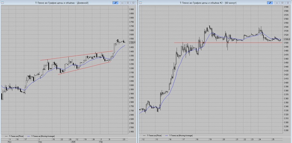 Т-Технологии продолжает торговаться в боковике. Относительно часового графика котировки сформировали уровень поддержки около цены 3500 руб.
