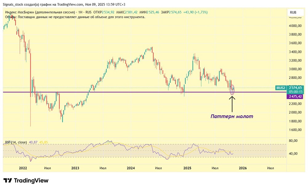Индекс Московской Биржи: что по рынку? Сразу к технике: на недельном таймфрейме сформировалась мощная свечная формация «молот». Правда, не совсем идеальная, с небольшим верхним фитилём, но в большинстве случаев это не помеха для её отработки. Вообще, на таких старших таймфреймах подобное формируется достаточно редко, но метко: • июль 2022 г. — отскок индекса на 22% • декабрь 2022 г. — полноценный разворот рынка (+68%) • декабрь 2023 г. — отскок индекса на 18% • сентябрь 2024 г. — отскок индекса на 14% В последнем случае техническая картина была почти как две капли воды с текущей ситуацией. Вот только не хочу давать ложных надежд: завтра Трамп проснётся не с той ноги или кто-нибудь сделает неаккуратное заявление, и рынок снова пригорюнится. Но при нейтральном фоне отскок продолжится. Важно: я не жду сейчас разворот рынка (драйверов пока нет), но именно продолжение тех. отскока напрашивается. Возможно, подвезут какие-то новости. В общем, как минимум следующая недельная свеча, скорее всего, будет зелёной. В конце недели посмотрим, насколько прогноз будет реализован. Не является индивидуальной инвестиционной рекомендацией Пост взят с соцсети [M O N D I A R A](https://i.mondiara.com/) 👉 вот ссылка на канал: https://i.mondiara.com/i/c/RUSSIA_INDEX_TA Скачать в [App Store](https://apps.apple.com/ru/app/m-o-n-d-i-a-r-a/id6475953453) Скачать в [Google Play](https://play.google.com/store/apps/details?id=com.mondiara.app) Валюта расчёта - Ваши добрые мысли! Спасибо, что с нами!
