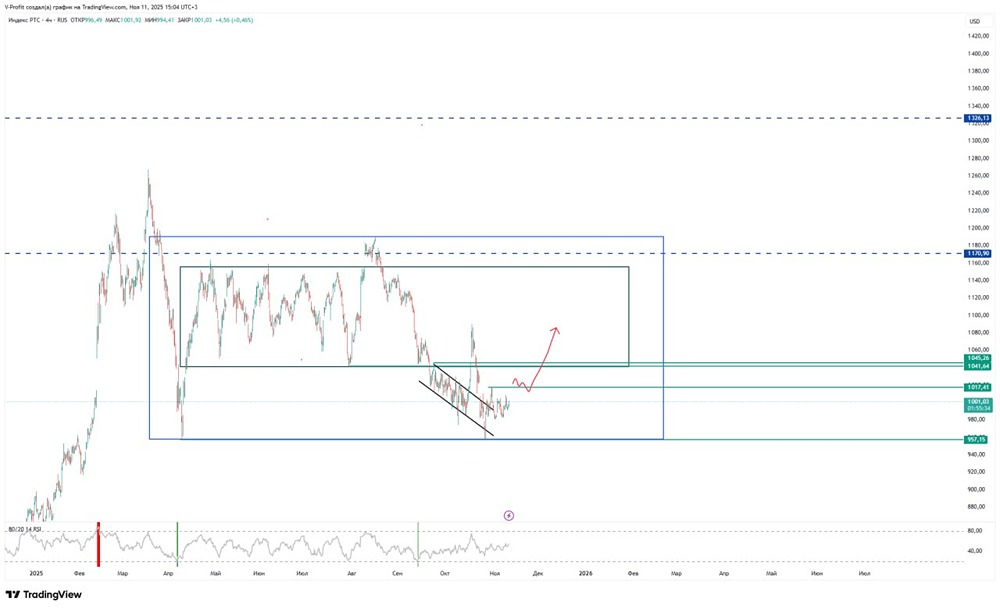 Для разворота вверх нужно пробивать уровень 1017, тогда ближайшей целью станет закрытие гэпов и, возможно, сформируется более большой торговый диапазон.