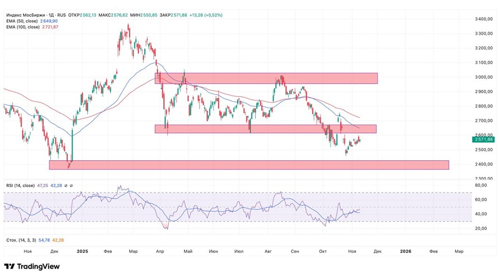 Индекс ненадолго отскочил от годового минимума (около 2457) до уровня 2580–2600. Это, скорее, временное восстановление после перепроданности и реакция на снижение внешнего давления, а не начало устойчивого роста.
