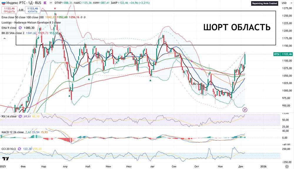 Принимать лонговые решения в РТС я не вижу смысла, так как опасно, ибо цена впадает в лютую точку перегретости, но от шорта готов буду рассмотреть его исключительно от уровня 1150–1170 пунктов.