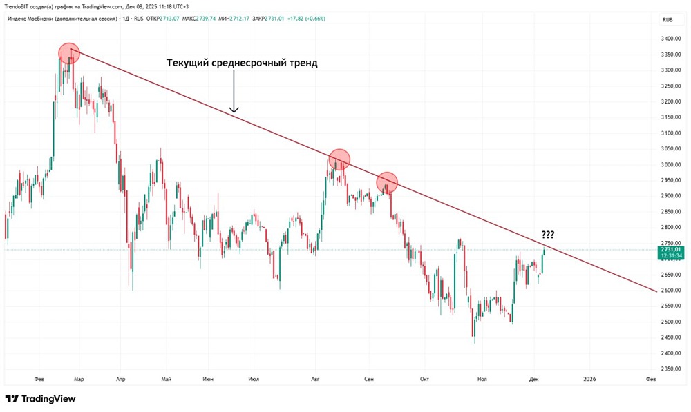 Что ждать на этой неделе: технический анализ и важные новости Наша рубрика расскажет, какие технические факторы и важные новости могут повлиять на российский рынок. Мы также выясним, на чьей стороне находятся «умные деньги». Техническая картина Среднесрочный нисходящий тренд сохраняется, но сейчас он испытывает максимальное давление. Если наклонная линия будет пробита, тренд завершится. Однако тренд проще продолжить, чем изменить. Локально ситуация другая: тренд направлен вверх, и попытки роста продолжаются. На графике формируется паттерн «Прямоугольник», цель которого — 2750 пунктов по индексу. Таким образом, локальный и среднесрочный тренды снова разошлись. Индикаторы Stochastic: не достигли перепроданности и развернулись. Из-за новостей индикатор часто даёт ложные сигналы. RSI: находится в середине диапазона, дивергенции нет. Скользящие средние: цена выше ЕМА 50 и ЕМА 100, но ниже ЕМА 200. Это ключевой уровень перед сменой тренда. «Умные деньги» После завершения экспирации юридические лица по-прежнему на стороне медведей. Дисбаланс сохраняется, и «умные деньги» продолжают ставить на снижение. Геополитика: важные новости выходных США и Европа не могут договориться по Украине. Европа призывает Киев не идти на территориальные уступки. Дональд Трамп-младший заявил на конференции в Дохе, что США могут прекратить поддержку Украины. Его отец не исключает выхода из переговорного процесса. Мирные переговоры по Украине в Майами завершились безрезультатно из-за нерешённых вопросов о гарантиях безопасности и территории — CNN. Трамп заявил, что Россия согласна на сделку, но не уверен, что Зеленский с этим согласен. Вывод На прошлой неделе я закрыл все спекулятивные короткие позиции. Сейчас многие активы подошли к уровням сопротивления. Если они будут пробиты, я начну спекулятивные покупки, но торопиться не стоит. Текущий рост основан на ожиданиях, и ситуация может быстро измениться. Новостной фон пока положительный, объёмы на прошлой неделе были ниже среднестатистических. Мы ждём информацию по переговорам. Всё зависит от переговорного процесса. Позитивные новости могут развернуть среднесрочный тренд. Не является индивидуальной инвестиционной рекомендацией Пост взят с соцсети [M O N D I A R A](https://i.mondiara.com/) 👉 вот ссылка на канал: https://i.mondiara.com/i/c/RUSSIA_INDEX_TA Скачать в [App Store](https://apps.apple.com/ru/app/m-o-n-d-i-a-r-a/id6475953453) Скачать в [Google Play](https://play.google.com/store/apps/details?id=com.mondiara.app) Валюта расчёта - Ваши добрые мысли! Спасибо, что с нами! Источник: Trendoman "Торговые сигналы"*