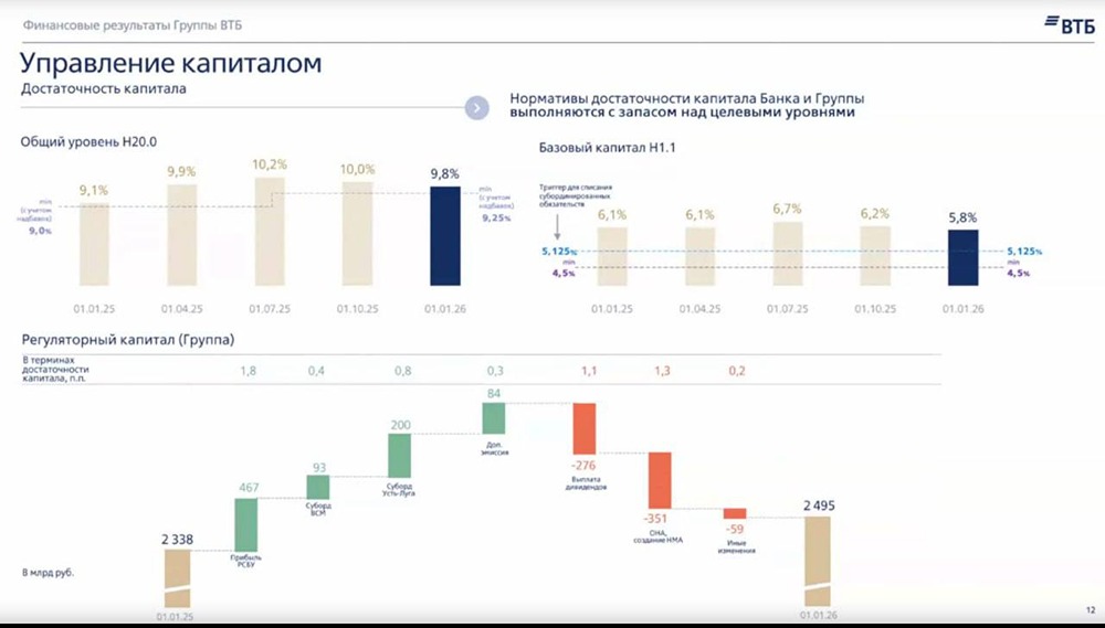Недавно вышел отчёт ВТБ. В этом посте я постараюсь ответить на вопрос, стоит ли покупать или продавать акции ВТБ по текущей цене (88–90 рублей за акцию). С отчётом всё понятно: прогноз на 2026 год хороший — банк может заработать 600–650 млрд рублей. Но важно разобраться в деталях. 1. Дивиденды: что говорят цифры? Прибыль ВТБ за 2025 год составила 502,1 млрд рублей. Однако эта сумма включает разовые доходы от работы с валютами, металлами и продажи непрофильных активов. Без учёта этих факторов банк получил бы убыток. Норматив достаточности капитала ВТБ составляет 9,8%. ЦБ требует не менее 10%, а в ближайшее время планирует повысить его до 11%. Поэтому банк не может выплатить дивиденды в размере более 25% от чистой прибыли. 2. Диалог с ЦБ С начала 2026 года ВТБ ведёт переговоры с ЦБ о возможности выплаты дивидендов в размере 50%. Это выгодно и государству, и акционерам. Однако ЦБ не готов к такому решению, так как ВТБ является основным кредитором проблемных компаний, таких как «Мечел». Менеджмент ВТБ заявляет, что дивиденды могут составить любое число из диапазона 25–50% от чистой прибыли. Решение по этому вопросу будет принято в середине апреля (15–20 числа). Чтобы повысить шансы на выплату дивидендов, банку нужно привлечь дополнительные средства. 3. Как ВТБ выплатил дивиденды в прошлом году? Для выплаты дивидендов в прошлом году ВТБ привлёк средства двумя способами: ➥ Выпустил субординированные облигации (суборды) на сумму 300 млрд рублей. Это «младший» долг компании, который предназначен для ограниченного круга лиц. ➥ Привлек дополнительные средства через допэмиссию акций. В прошлом году она была по 84 рубля за акцию и привлекла менее 100 млрд рублей. Оба способа тяжелы в реализации: допэмиссия портит репутацию банка, а информации о новых субордах пока нет. 4. Новые шаги ВТБ На недавнем звонке банк объявил о планах продать непрофильные активы. Кроме того, ВТБ хочет продать около 300 млрд рублей необеспеченных розничных кредитов до 1 апреля. Скорее всего, частично покупателем выступит «Дом.рф». Эти меры могут позволить банку увеличить достаточность капитала и выплатить дивиденды в большем размере, чем 25% от чистой прибыли. Однако важно успеть реализовать эти планы до апреля. Итог На данный момент банк не может выплатить 25% от чистой прибыли из-за требований ЦБ. К началу апреля банк может увеличить достаточность капитала, но ЦБ также ужесточит требования. Мой консенсус — дивиденды составят 35% от чистой прибыли или около 13 рублей на акцию. Это будет основным драйвером роста акций ВТБ в ближайшие годы. Из идей: ➥ Если акция будет стоить 80 рублей, я бы её купил. ➥ Если акция будет 90 рублей и выше к апрелю, я бы, возможно, даже продал её (хотя базово её могут тянуть выше к апрелю). Главное — сыграть против рынка, когда он будет фиксировать потенциальный дивиденд. Не является индивидуальной инвестиционной рекомендацией Пост взят с международного информационного сервиса [M O N D I A R A](https://mondiara.com) [Скачать](https://apps.apple.com/ru/app/m-o-n-d-i-a-r-a/id6475953453) приложение в App Store [Скачать](https://play.google.com/store/apps/details?id=com.mondiara.app) приложение в Google Play Источник: FutureTrading | Alexsey Efimov