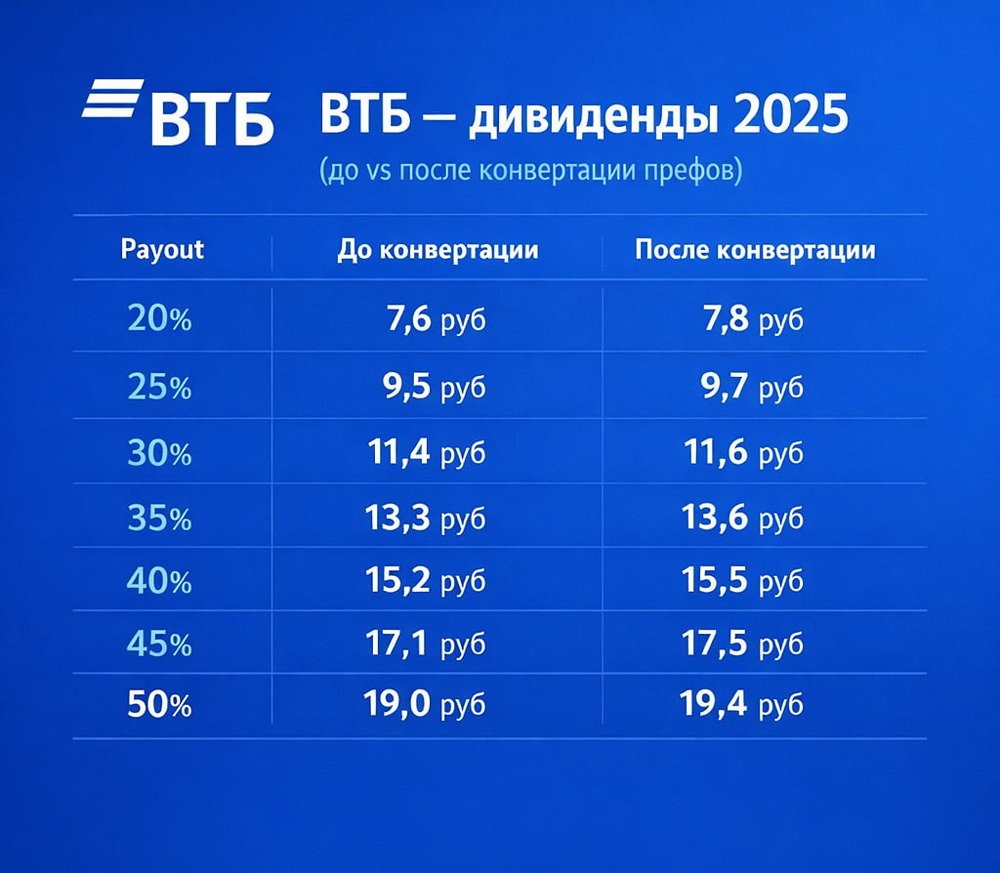 ВТБ: отчет за 2025 год. Дивиденды: 8 или 19 рублей? Банк ВТБ опубликовал отчет по МСФО за 2025 год, и результаты оказались предсказуемыми. Основные показатели: - Прибыль: 502 млрд рублей (-9% по сравнению с прошлым годом). - Чистые процентные доходы: 434 млрд рублей (-11% по сравнению с прошлым годом). - Чистые комиссионные доходы: 307 млрд рублей (+14% по сравнению с прошлым годом). - Прочие операционные доходы: 445 млрд рублей (+40% по сравнению с прошлым годом). - Прибыль на акцию (EPS): 79 рублей (-16% по сравнению с прошлым годом). Рентабельность капитала: ROE составил 18,3%, что значительно ниже прошлогоднего показателя в 22,9%. Это один из худших результатов в банковском секторе. Руководство ВТБ прогнозирует, что в 2026 году этот показатель превысит 20%. Непостоянные доходы: Непостоянные доходы составили 504 млрд рублей. Если их исключить, чистая прибыль банка окажется отрицательной. Основная часть прибыли формируется за счет разовых и непостоянных статей, а не стабильных источников, как в других банках. Чистая процентная маржа: В четвертом квартале 2025 года чистая процентная маржа составила 2%, что лучше показателя в 0,8% в четвертом квартале 2024 года. Это положительный тренд, который связан с снижением ключевой ставки. Достаточность капитала: На 1 января 2026 года достаточность капитала ВТБ составляет 9,8%. При этом минимальный норматив от ЦБ на 2025 год — 9,25%, на 2026 год — 10%, а на 2027 год — около 10,75%. Достаточность капитала — важный показатель, который показывает, может ли банк выплачивать дивиденды. У ВТБ самая низкая достаточность капитала в секторе (9,8%). Для сравнения: у БСПБ этот показатель составляет 21,5%, у Т-Технологий — 14%, а у Сбера — 13,6%. По нормативам ЦБ ВТБ не соответствует требованиям по достаточности капитала, что делает выплату повышенных дивидендов невозможной. Возможно, банк сейчас ведет переговоры с ЦБ по этому вопросу. Дивиденды: Существует идея о выплате дивидендов ВТБ, если payout составит 40-50% от прибыли (без условий дополнительных эмиссий). Однако по моим расчетам, при текущем уровне достаточности капитала (H20.0) payout может составить максимум 25-30%. - При 25% payout дивиденд составит 9,48 рубля (10,7% дивидендной доходности). - При 30% payout дивиденд составит 11,37 рубля (12,8%). Если конвертация привилегированных акций в обыкновенные пройдет до дивидендной отсечки, формула расчета дивидендов изменится. ВТБ планирует конвертировать 24,4 трлн привилегированных акций (номиналом 0,01 и 0,1 рубля) в обыкновенные акции (номиналом 50 рублей). В результате будет выпущено 6,3 млрд новых обыкновенных акций. После конвертации у ВТБ будет 12,93 млрд акций. Это упростит расчет дивидендов: вместо того чтобы вычитать дивиденды по привилегированным акциям и затем рассчитывать дивиденды по обыкновенным, можно будет просто делить прибыль на общее количество акций. Конвертация запланирована на май, а дивидендная отсечка — на июль. Однако эти даты могут измениться. Если конвертация произойдет до дивидендной отсечки, значения дивидендов будут скорректированы: - При 25% payout дивиденд составит 9,7 рубля (11% дивидендной доходности). - При 30% payout дивиденд составит 11,64 рубля (13% дивидендной доходности). Выводы: При ROE в 20% и дивидендах 11-13% ВТБ сможет расти на 7-9%, что сопоставимо с показателями Сбера. Оценка по P/E составляет 2 (на 2025 год) и 1,7 (на 2026 год). Это низкая оценка, которая может раскрыться при выплате дивидендов в размере 40-50%.