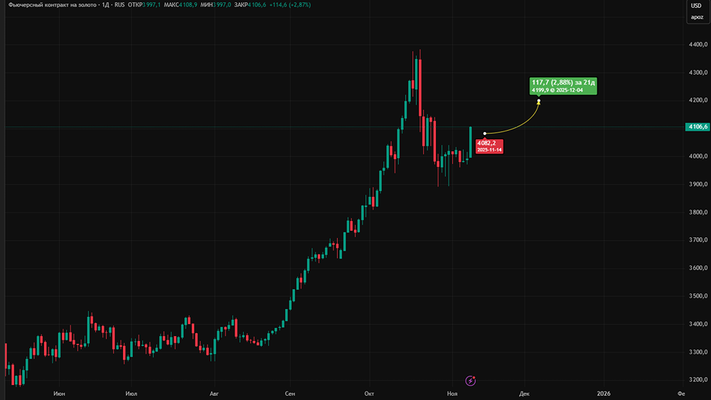 Мнение: Freedom Finance Global Золото растет на новостях о возможном окончании шатдауна в США Золото уверенно растёт в цене. Утром оно подорожало на 1,93% до $4087,3 за унцию. Драгметалл пытается достичь отметки в $4100, но это даётся ему нелегко. Новости о соглашении между Трампом и оппозицией в Конгрессе о прекращении шатдауна и возобновлении работы правительства встретили с энтузиазмом на сырьевых рынках, включая нефть, металлы и драгметаллы. Инвесторы переключились на защитные и рискованные активы. Доллар снижается на 0,06% и находится ниже 100 пунктов. Угроза серьёзных экономических проблем в США миновала, и инвесторы ищут более доходные активы, такие как драгметаллы. Серебро также растёт в цене на фоне общего оптимизма — оно подорожало на 3,2% до $49,69 за унцию. В Китае спрос местных инвесторов на золотые слитки и монеты за 9 месяцев 2025 года вырос на 25% до 352,12 тонн. Однако спрос на золото со стороны китайской ювелирной промышленности упал на 33% до 270 тонн за тот же период. Вероятно, из-за высокой стоимости золота ювелиры переключаются на более доступные драгметаллы, в первую очередь на серебро, спрос на которое продолжает расти. Мы ожидаем, что к концу 2025 года цена золота достигнет $4200 за унцию. Автор: Мильчакова Наталья Не является индивидуальной инвестиционной рекомендацией Пост взят с соцсети [M O N D I A R A](https://i.mondiara.com/) 👉 вот ссылка на канал: https://i.mondiara.com/i/c/OIL_TA Скачать в [App Store](https://apps.apple.com/ru/app/m-o-n-d-i-a-r-a/id6475953453) Скачать в [Google Play](https://play.google.com/store/apps/details?id=com.mondiara.app) Валюта расчёта - Ваши добрые мысли! Спасибо, что с нами! Источник: finam.ru