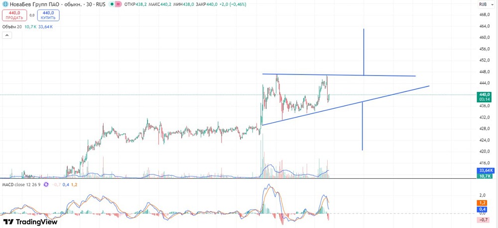 Актив движется в треугольнике, возможны два варианта развития событий. Следим за пробоем и готовимся к действию.