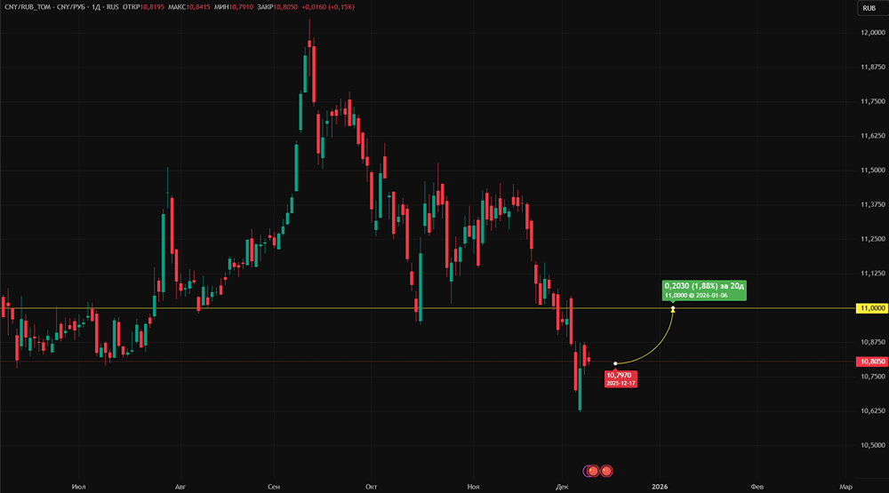 В понедельник рубль слегка ослаб. Однако это движение было незначительным. Ожидалось, что смягчение лимитов на переводы физических лиц за границу не сильно повлияет на курс российской валюты в краткосрочной перспективе. Сегодня курс юаня к рублю составляет около 10,82 рублей за юань. Другие валюты развивающихся рынков утром показывают разнонаправленную динамику. В текущей ситуации диапазон 10,75–11,00 рублей за юань остается актуальным для курса. При этом курс может временно опускаться ниже этих границ.
