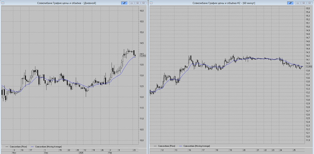 Рост в рамках откупа от линии дневной скользящей МА-13 жду в акциях Совкомбанка. В моменте уже есть первые попытки данного процесса. До конца вечерней сессии котировки, скорее всего, закрепятся над линией часового индикатора МА-13 и уже в четверг продолжат откуп в район цены 14,1 руб. Кроме дневного индикатора, поддержкой тут выступает и часовой уровень около цены 13,8 руб.