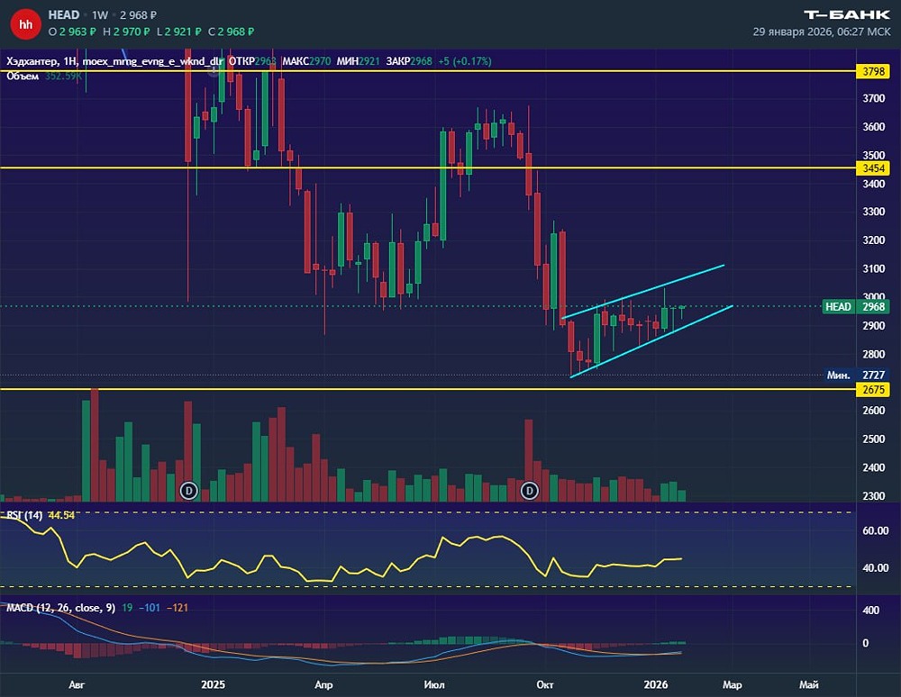 Ох как некрасиво движется «Хэдхантер» в рамках восходящего канала. Тут явное формирование медвежьего флага на недельном ТФ, что приведёт к падению вплоть до 2675.