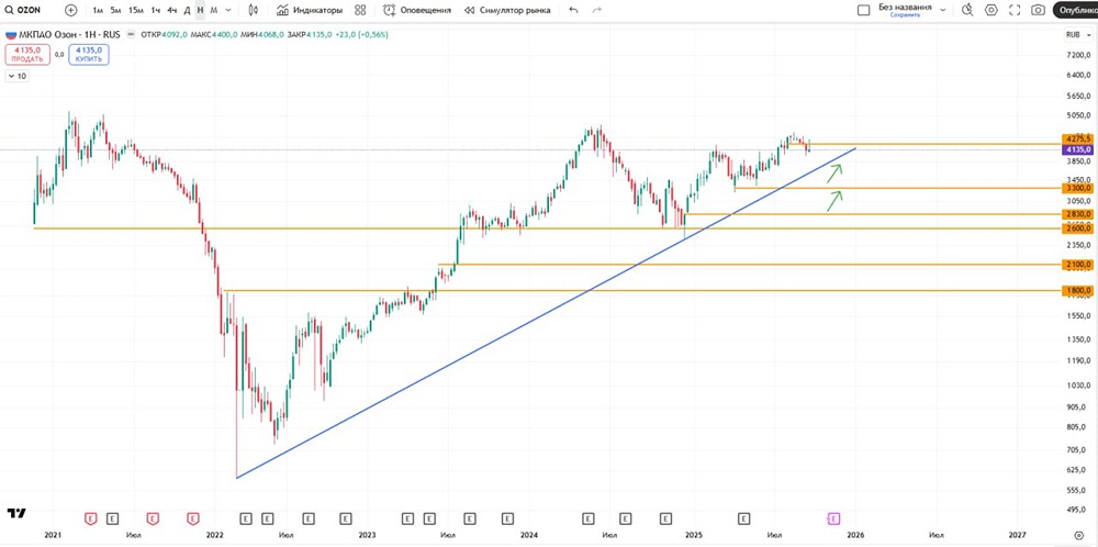 Как изменится цена акций OZON после возобновления торгов — технический анализ? Интересный факт о компании OZON создал одну из самых сложных и эффективных логистических систем в России. Её складские площади превышают 1 500 000 кв.м., что больше площади 200 футбольных полей. Компания развивает собственную курьерскую службу Ozon Express и авиаперевозки через Ozon Airlines, чтобы быстро доставлять товары в отдалённые регионы. Анализ акций Торги акциями приостановлены, но завтра они, вероятно, возобновятся. В первый день после возобновления торгов я бы не спешил покупать акции, а понаблюдал бы за их движением. С июня 2022 года акции компании находятся в восходящем тренде. В мае 2024 года они достигли исторических максимумов, но затем начался откат после двух лет роста. На данный момент трендовая линия проходит на уровне около 3650. Значимые уровни поддержки находятся на 3300 и 2830, причём на последнем уровне у акций остался небольшой гэп. Старт торгов, скорее всего, будет позитивным, но после первых двух дней нужно будет оценить, сможет ли компания сохранить восходящий тренд или начнётся локальная коррекция. В первый день акции не кажутся мне привлекательными для спекуляций из-за высокой волатильности. Кроме того, компания объявила о планах провести buyback на 25 млрд рублей и впервые пообещала выплатить дивиденды. Новостной фон вокруг компании очень позитивный. Завтра, пожалуй, лучше воздержаться от покупок. Не является индивидуальной инвестиционной рекомендацией Пост взят с соцсети [M O N D I A R A](https://i.mondiara.com/) 👉 вот ссылка на канал: https://i.mondiara.com/i/c/ozon_analytics Скачать в [App Store](https://apps.apple.com/ru/app/m-o-n-d-i-a-r-a/id6475953453) Скачать в [Google Play](https://play.google.com/store/apps/details?id=com.mondiara.app) Валюта расчёта - Ваши добрые мысли! Спасибо, что с нами! Источник: ИНВЕСТИРУЕМ ВМЕСТЕ