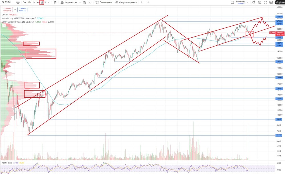 Анализ компании Сектор: Интернет-магазин Последний обзор по Ozon я проводил 18 августа. Тогда акции стоили 4455 рублей, и я ожидал их роста до 5150 рублей с последующей коррекцией до 3240 рублей. В реальности акции поднялись до 4576 рублей, а затем упали до 3811 рублей. Таким образом, они не достигли ни одного из моих прогнозов, но движение было в ожидаемом направлении, хотя и с меньшей волатильностью, чем я предполагал. Сейчас акции торгуются по 4030 рублей после двухмесячного перерыва. Рассмотрим основные новости и подумаем о будущем. Основные метрики - Капитализация: $10,39 млрд - P/E: отрицательное значение, компания все еще убыточна за год - P/S: 0,95 - P/B: минус 6,25 - EPS: минус 103,2 рубля - EBITDA: 100,8 млрд рублей - EV/EBITDA: 5,36 По сравнению с прошлым обзором, компания сократила годовую убыточность, а в квартальном отчете также показала прибыль. Рассмотрим последний отчет подробнее. Новостной фон - Бумаги Ozon вернулись на Мосбиржу 11 ноября. - Ozon планирует выйти в офлайн-формат, сообщил советник компании Александр Шульгин (ТАСС). - ФАС к январю 2028 года разработает проекты законов по антимонопольному регулированию маркетплейсов (Кабмин). Финансовое здоровье - Собственный капитал за третий квартал 2025 года остался отрицательным, но вырос на 3,6% по сравнению с 2024 годом — с минус 132,5 млрд рублей до минус 137,3 млрд рублей. Важно отметить, что темпы роста отрицательного капитала снизились, что является положительным сигналом. - Чистый долг также отрицательный и увеличился в 3,5 раза по сравнению с 2024 годом — с минус 89,9 млрд рублей до минус 318,1 млрд рублей. - Net Debt / EBITDA: минус 3,15. Ситуация начинает улучшаться, и это главный позитивный момент. Финансовое состояние компании остается сложным, но, кажется, она приближается к точке разворота. Выручка и прибыль - Выручка за третий квартал 2025 года составила 905 млрд рублей, что на 49% больше, чем в 2024 году (615 млрд рублей). - Прибыль за третий квартал 2025 года уменьшилась до минус 22 млрд рублей, хотя в 2024 году она была минус 59 млрд рублей. - Свободный денежный поток за третий квартал 2025 года достиг 446 млрд рублей, что на 108% больше, чем в 2024 году (215 млрд рублей). Будущее и оценки - В августе несколько аналитиков поставили таргеты на акции Ozon в диапазоне от 5200 до 6400 рублей. Основные акционеры - 31,8% акций принадлежит АФК «Система». - 27,1% акций контролирует Александр Чачава. Сравнение с конкурентами Основной конкурент — Wildberries, но у них нет листинга. Для сравнения можно рассмотреть М.Видео, «ВсеИнструменты», а также Яндекс и Сбербанк, которые имеют аналогичные структуры. Ozon — средняя по капитализации компания, но из-за текущей убыточности она уступает конкурентам по финансовым метрикам. Дивиденды Компания обещала выплатить дивиденды в размере 3,57% в декабре, что станет первым дивидендным потоком. Однако делать ставку на регулярные дивиденды Ozon пока рано. Технический анализ Сейчас акции Ozon находятся на нижней границе восходящего канала. Возможны два сценария: если продавцы возьмут верх и акции упадут ниже 3800 рублей, они могут скорректироваться до 3200 рублей. Если же покупатели удержат цену выше 3800 рублей и начнутся активные покупки, акции могут подняться до 5150 рублей. В обоих случаях в долгосрочной перспективе ожидается рост, но в краткосрочной перспективе возможны различные варианты развития событий, зависящие от экономической ситуации в России и регуляторных 