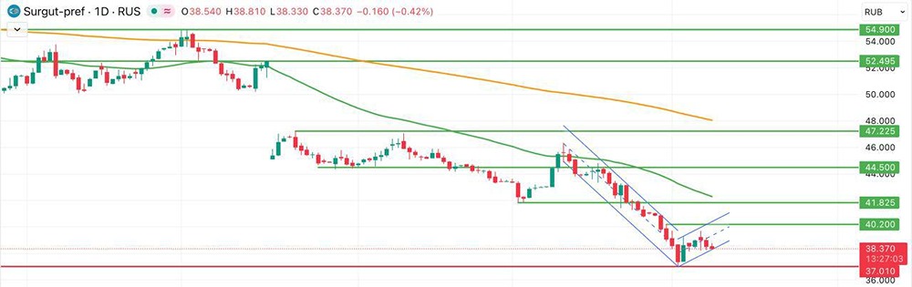🔸 В ближайшие дни префы Сургута способны продолжить консолидацию около текущего уровня, в диапазоне 37–40,2 руб. Существенное улучшение среднесрочной технической картины состоится в случае уверенного превышения значимого круглого уровня 40 руб.