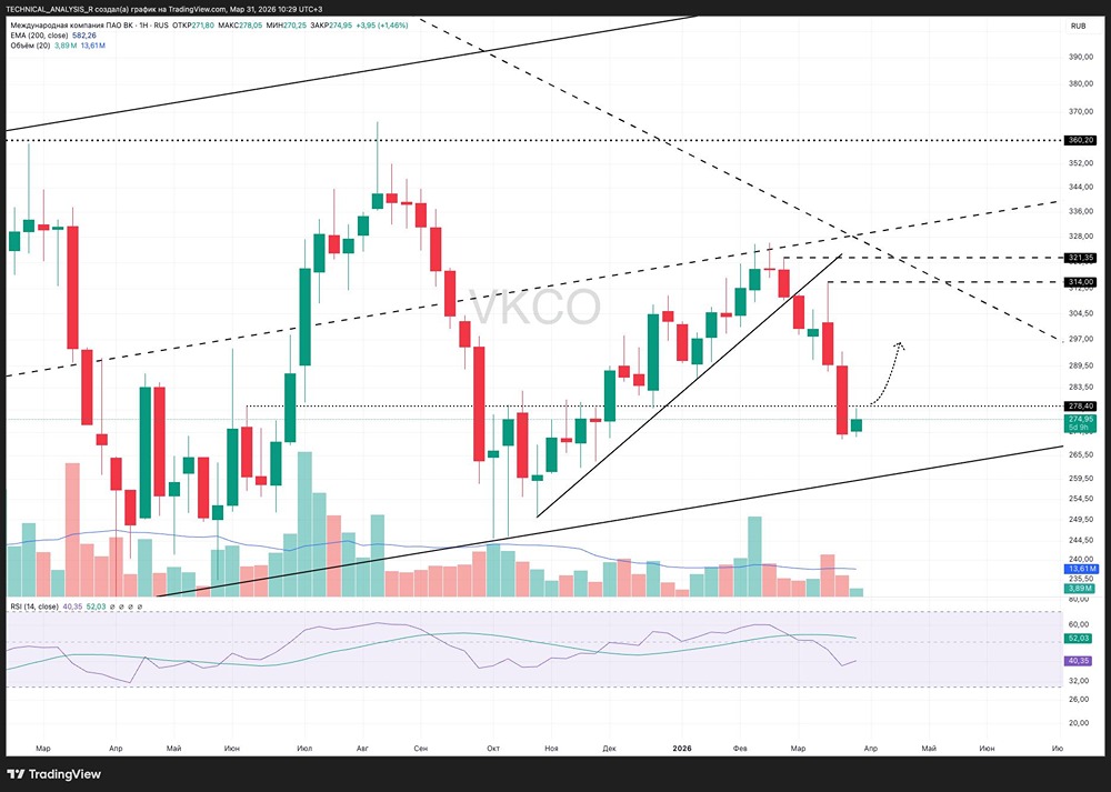 ⚠️ ВК вышел из локального восходящего движения и дал импульс вниз после пробоя трендовой. Цена сейчас находится у ближайшей поддержки в районе 270-275.