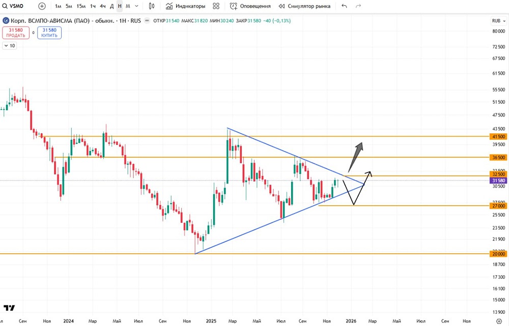 Актив чуть не достиг уровня 27 000, как было отмечено в прошлом анализе, но затем откатился назад. Сейчас на рынке много треугольников, и АВИСМА — не исключение. Здесь тоже формируется подобная фигура.