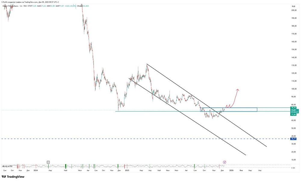 Сформировано условие для разворота: сейчас нужно, чтоб цена пробила уровень сопротивления 76,16, тогда сформируется свежая зона поддержки и цена закрепится выше предыдущего минимума.
