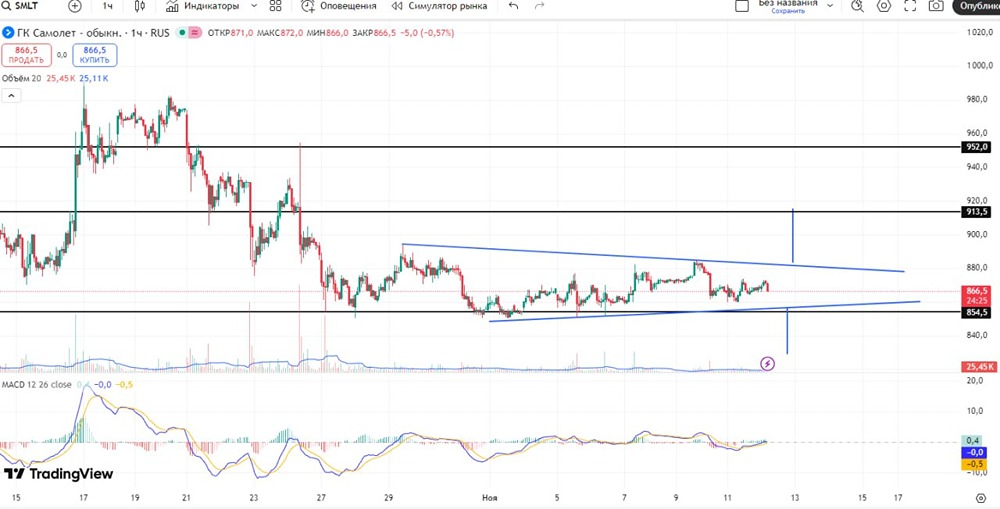 Актив находится в клине, возможны два варианта развития событий. Ждем пробоя и готовимся к действию.