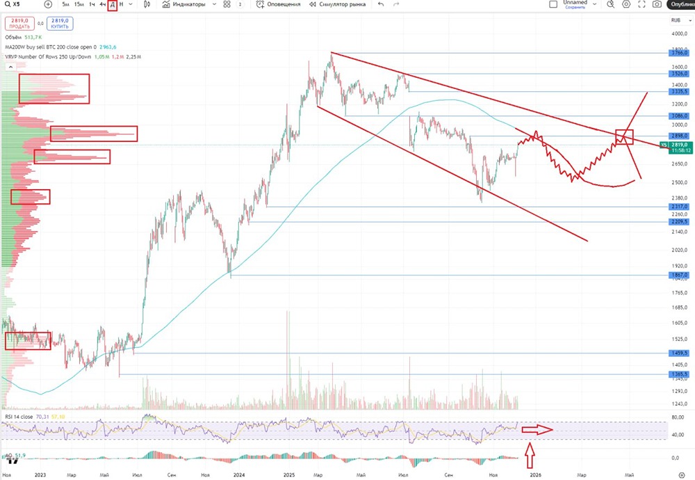 Аналитика компании X5 Retail Group Сектор: Розничная торговля продуктами и потребительскими товарами. Последний обзор компании был 6 сентября. Тогда акции стоили 2911 рублей. Я ожидал их снижения до 2600 рублей и писал о сменившемся нисходящем тренде. Акции действительно упали до этого уровня, задержались на нем на несколько дней, а затем продолжили снижение. В какой-то момент они достигли 2347 рублей. Теперь посмотрим, что нас ждет дальше. Основные метрики: - Капитализация: 9,74 миллиарда долларов. - P/E: 9,62. - P/S: 0,17. - P/B: 4,44. - EPS: 288,4 рубля. - EBITDA: 408,9 миллиарда рублей. - EV/EBITDA: 4,04. По сравнению с прошлым обзором прибыль компании снизилась, а ее оценка по метрикам немного выросла. Давайте разберем последний отчет. Новостной фон: - X5 планирует продать казначейский пакет акций (9,7% от общего числа) в течение трех лет. - Выручка компании за третий квартал 2025 года выросла на 18,5%. - «Пятерочка» намерена открыть более 2 тысяч магазинов в России в этом году и увеличить свою долю на рынке. - Компания обновила коммуникационную стратегию: отказалась от дескриптора Group и изменила визуальный стиль, оставив лаконичное название X5. - X5 начал открывать ультрамалые магазины, запустив в тестовом режиме точки «Налету!». Финансовое здоровье: - Собственный капитал за девять месяцев 2025 финансового года сократился на 37%. В первом полугодии 2025 было минус 46%. Хотя ситуация улучшилась, рост СК в 2024 году составил 25%. - Чистый долг за девять месяцев 2025 увеличился на 7%. За первое полугодие 2025 рост составил 4%, а в 2024 — 3%. - Net Debt / EBITDA — 2,25, что является средней долговой нагрузкой для компании. Финансовое состояние компании хорошее: СК падает, но медленнее, чем в первом полугодии 2025, а долговая нагрузка остается умеренной. Выручка и прибыль: - Выручка за девять месяцев 2025 выросла на 15%. В 2024 рост составил 24%. - Прибыль за тот же период упала на 24%. В первом полугодии 2025 снижение составило 11%, а в 2024 был рост на 32%. - Свободный денежный поток за девять месяцев 2025 снизился на 41%. Будущее и прогнозы: - Два свежих прогноза: от КИТ Финанс (6 ноября) — 3000 рублей, от Финам (17 ноября) — 3470 рублей. Старые прогнозы: от 3650 до 4500 рублей. Основные акционеры: - 47,9% акций принадлежат CTF Holdings S.A. - 11,4% акций контролирует Intertrust Trustees Ltd. Сравнение с конкурентами: - X5 — крупнейшая по капитализации компания в своем секторе. - По метрикам компания оценивается в среднем по рынку. - Долговая нагрузка соответствует средней по сектору. - Рентабельность выше средней по сектору. - Рост выручки за пять лет в среднем по рынку. Дивиденды: - В июле 2025 компания выплатила 648 рублей на акцию, что составляет около 18,8%. - На начало января 2026 запланирована выплата дивидендов за третий квартал 2025 в размере 13,05%. Технический анализ: На графике я отобразил мысли по движению цены. Сейчас мы подходим к зоне, где может начаться коррекция. Также стоит учесть дивидендный гэп, который ожидается в начале января. Этот график не учитывает возможное окончание СВО, которое может существенно изменить ситуацию. Выводы: У компании есть свои плюсы и минусы. Она продолжает выплачивать дивиденды и растет, но эти процессы замедлились. Собственный капитал падает, но медленнее, чем в первом полугодии 2025. Прибыль снижается, что может свидетельствовать о снижении покупательской способности населения. Ситуация может улучшиться при снижении ставок, перезапуске экономики и увеличении доходо