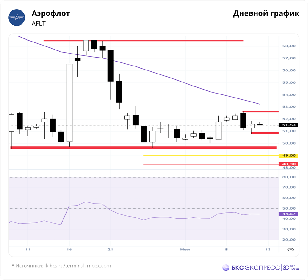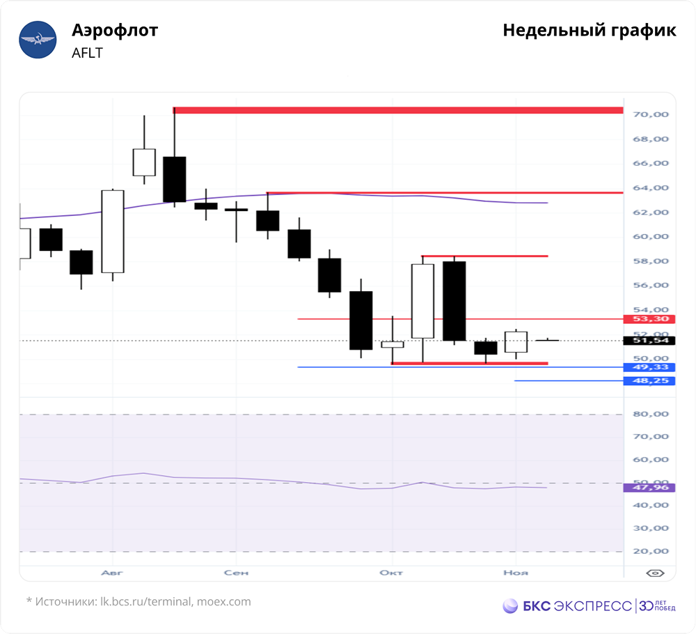 Мнение: БКС Экспресс Взгляд на акции Аэрофлота На прошлой торговой сессии акции «Аэрофлота» выросли на 0,6%, завершив день на отметке 51,6 рубля. Бумаги показали себя лучше рынка, объем торгов составил 0,65 млрд рублей. Краткосрочная картина • В понедельник продавцы активизировались, установив локальный максимум на уровне 52,64 рубля. • Для дальнейшего снижения к целям 49–48,3 рубля по дневному графику необходимо преодолеть поддержку 50,82 рубля. Цели остаются актуальными, пока не будет пробита линия сопротивления 53,07 рубля. • На дневном таймфрейме RSI находится на уровне 44 пунктов, а на 4-часовом — между 50- и 200-дневной скользящими средними. Важно следить за уровнями сопротивления и поддержки: 53,07 и 49,64 рубля соответственно. Внешний фон • Индекс S&P 500 во вторник вырос на 0,22%, а утром прибавил еще 0,2%. Азиатские индексы торгуются в основном в плюсе. Нефть Brent поднялась на 1,72% во вторник, но утром потеряла 0,3%. Уровни сопротивления: 52,64, 53,07, 58,5 Уровни поддержки: 50,82, 49,64, 46,5 Долгосрочная картина • Структура недельного графика допускает еще одну волну снижения с целями 49,33–48,25 рубля. • Сценарий продолжения падения остается актуальным, пока не будет сломана линия сопротивления 53,07 рубля. • В долгосрочной перспективе важно следить за закрытием недельной свечи в конце пятницы. Фундаментальные показатели • «Аэрофлот» опубликовал слабые операционные данные за сентябрь: пассажиропоток упал на 5,7% в годовом выражении до 5 млн человек, а пассажирооборот снизился на 1,3%. • Международные перевозки выросли, что указывает на сохранение спроса, но внутренние рейсы показали заметное снижение. Средние ставки на международных рейсах обычно выше, поэтому говорить о негативном влиянии на выручку пока рано. • Компания пытается активнее монетизировать более выгодный международный трафик. Наблюдается снижение налета по парку на 1,5% и уменьшение количества рейсов на внутренних линиях. Возможно, это связано с экономией ресурса самолетов, но пока ситуация не критична и остается нейтральной. • Операционные данные за третий квартал продолжают демонстрировать замедление внутреннего трафика. Важны тренды по стоимости среднего билета и динамике издержек. • Мы сохраняем негативный взгляд на компанию. Акция на текущих уровнях выглядит переоцененной, но в условиях геополитической неопределенности может резко вырасти. Положительными факторами могут стать открытие новых южных аэропортов и возобновление авиасообщения с США. Автор: Мамонтов Андрей Не является индивидуальной инвестиционной рекомендацией Пост взят с соцсети [M O N D I A R A](https://i.mondiara.com/) 👉 вот ссылка на канал: https://i.mondiara.com/i/c/aeroflot_analytics Скачать в [App Store](https://apps.apple.com/ru/app/m-o-n-d-i-a-r-a/id6475953453) Скачать в [Google Play](https://play.google.com/store/apps/details?id=com.mondiara.app) Валюта расчёта - Ваши добрые мысли! Спасибо, что с нами! Источник: bcs-express.ru