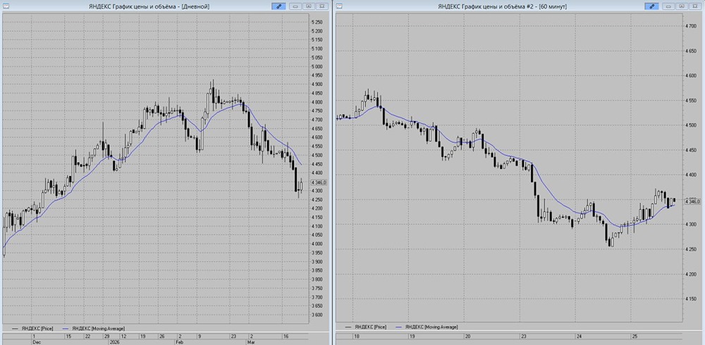❗️ ЯНДЕКС пытается перейти к фазе боковика после активной фазы снижения. Текущее сочетание крайних двух дневных свечей, а также закрепление над линией часового индикатора МА-13 способствует росту котировок в четверг – пятницу к ценам 4400 – 4500 руб.