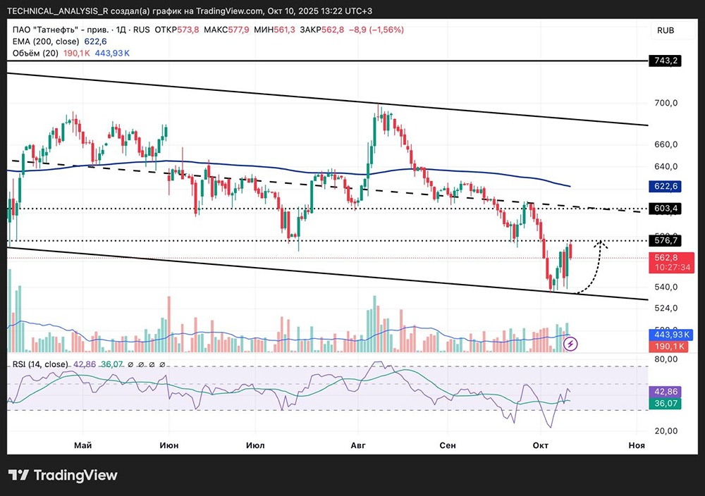 При уходе ниже 545 сценарий отскока сломается, и бумага может снова уйти к нижней границе канала.