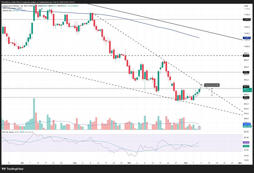 Частичное закрытие прибыли выглядит логичным, а стоп стоит перевести в безубыток — рынок всё ещё в нисходящем канале. При пробое верхней границы может начаться ускорение к 900-926.