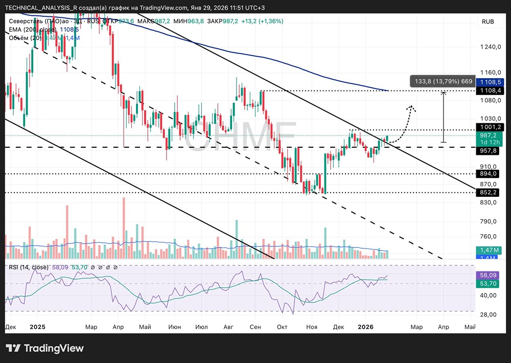 Ключевая цель по отскоку — EMA200 в зоне 1108. Это первый серьёзный уровень, где рост может замедлиться. Потенциал движения до неё около 13-14%.