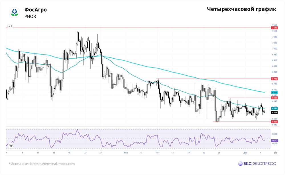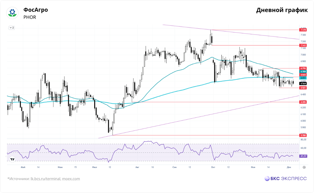Мнение: БКС Экспресс Торговый взгляд на акции ФосАгро В четверг акции ФосАгро подешевели на 0,33%, завершив день на уровне 6564 руб. Объем торгов был низким — всего 0,21 млрд руб. Сегодня утром акции немного подросли, прибавив 0,1%. Краткосрочная перспектива • В четверг акции ФосАгро слегка просели на фоне низкой торговой активности. Большинство российских бумаг выросли. Индекс МосБиржи закрылся в плюсе на 0,2%, а после вечерней сессии прибавил еще 0,14%. • Утром акции немного подорожали, но затем начали падать. Несмотря на это, общий дневной убыток был небольшим. • Днем сформировалась маленькая черная свеча, которая не слишком значима. Ее можно считать нейтральным сигналом. • Последние две недели акции двигаются в узком диапазоне 6501–6665 руб., оставаясь ниже 200-дневной скользящей средней. Попытки выйти за пределы диапазона были неудачными, но сильных признаков снижения не появилось. • Сейчас лучше подождать. Диапазон узкий, поэтому прибыль от торговли в нем будет скромной. Открывать сделку стоит при выходе из диапазона в сторону пробоя. • Индекс МосБиржи завершил день нейтрально. Он держится выше уровня поддержки 2600–2620 п., оставляя потенциал для роста к 2700 п. Внешний фон В четверг S&P 500 вырос на 0,11%, фьючерсы на индекс утром в плюсе на 0,2%. Азиатские индексы разнонаправленные. Фьючерсы на Brent на Мосбирже прибавили 0,78%, а на международных площадках нефть утром подешевела на 0,2% до $63,1 за баррель. Уровни сопротивления: 6665 / 6795 / 7143 Уровни поддержки: 6501 / 6285 / 6000 Долгосрочная перспектива • Глобальный тренд акций — восходящий, начавшийся в августе 2014 года. • Нисходящий тренд с марта 2022 года был сломлен в середине декабря, но устойчивого роста не последовало. Тренд перестроен по последним максимумам. • На недельном графике преобладают продажи. Акции медленно снижаются, но разворотных сигналов пока нет. Локальной поддержкой может стать среднесрочный восходящий тренд на уровне 6370 руб. • Аналитики БКС оценивают перспективы негативно. Целевая цена на год — 7300 руб. Автор: Решетников Олег Не является индивидуальной инвестиционной рекомендацией Пост взят с соцсети [M O N D I A R A](https://i.mondiara.com/) 👉 вот ссылка на канал: https://i.mondiara.com/i/c/fosagro_analytics Скачать в [App Store](https://apps.apple.com/ru/app/m-o-n-d-i-a-r-a/id6475953453) Скачать в [Google Play](https://play.google.com/store/apps/details?id=com.mondiara.app) Валюта расчёта - Ваши добрые мысли! Спасибо, что с нами! Источник: bcs-express.ru