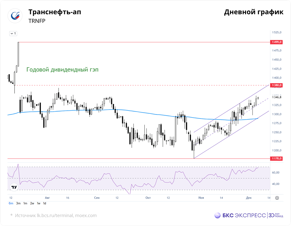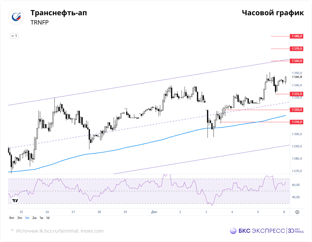 Мнение: БКС Экспресс Анализ акций компании Транснефть-ап В минувшую пятницу префы «Транснефти» подорожали на 1,33% и достигли 1342,8 руб. Объем торгов составил 0,6 млрд руб. Утром акции выросли на 0,13% до 1344,6 руб. Краткосрочная перспектива Акции показали умеренное повышение при среднем торговом обороте. Они заметно отстали от индекса МосБиржи, который вырос на 2,11%, но все же обновили максимум почти за четыре месяца. На дневном графике сохраняется восходящий тренд, начавшийся полтора месяца назад. Внутри дня сопротивление находится на уровне 1350 руб. Закрытие сессии выше 200-часовой средней цены говорит о позитивной краткосрочной технической картине. Умеренно высокий утренний уровень индекса относительной силы RSI указывает на то, что акции вышли из состояния перекупленности. Обновление среднесрочного максимума дает основания для продолжения роста. Значимой целью выступает уровень 1360 руб. Преодоление этого уровня может занять время. Внешний фон Индекс S&P 500 вырос на 0,19%. Фьючерсы на S&P 500 утром поднимаются на 0,2%. Ключевыми азиатскими индексами движут разнонаправленные тенденции. Нефть Brent подешевела на 0,1% до $63,7 за баррель. Уровни сопротивления: 1360/1370/1380 Уровни поддержки: 1333/1320/1310 Долгосрочная перспектива После дробления акции «Транснефти» продолжают двигаться в средней части двадцатилетнего диапазона. Значительный рост от текущих уровней затруднен из-за множества старых технических сопротивлений. В конце ноября акции превысили 200-дневную среднюю цену. Долгосрочная техническая картина остается нейтральной, учитывая широкий диапазон. Аналитики БКС прогнозируют цену в 1800 руб. через год, что предполагает рост на 34% от текущих уровней. Автор: Манжос Виталий Не является индивидуальной инвестиционной рекомендацией Пост взят с соцсети [M O N D I A R A](https://i.mondiara.com/) 👉 вот ссылка на канал: https://i.mondiara.com/i/c/transneft_analytics Скачать в [App Store](https://apps.apple.com/ru/app/m-o-n-d-i-a-r-a/id6475953453) Скачать в [Google Play](https://play.google.com/store/apps/details?id=com.mondiara.app) Валюта расчёта - Ваши добрые мысли! Спасибо, что с нами! Источник: bcs-express.ru