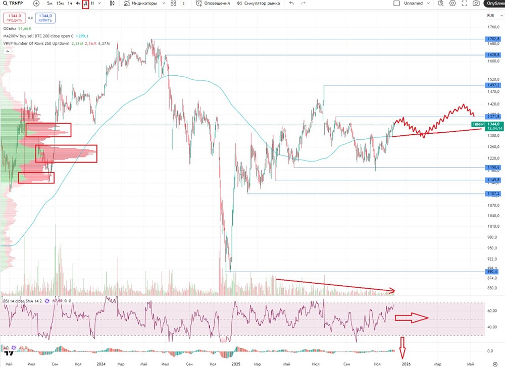 Почему Транснефть может вырасти до 1600 рублей: прогнозы экспертов? Анализ компании Сектор: Трубопроводная компания, транспортировка нефти и нефтепродуктов. Последний обзор «Транснефти» я провел 25 сентября. Тогда акции стоили 1249 рублей, и я ожидал небольшого роста до 1350 рублей, предполагая слабые движения. В реальности акции поднялись до 1310 рублей, скорректировались до 1180 рублей и сейчас снова растут, достигнув ожидаемого уровня 1350 рублей. Сейчас акции торгуются по 1340 рублей. Посмотрим, что будет дальше. Основные метрики - Капитализация: 12 миллиардов долларов. - P/E — 3,42. - P/S — 0,64. - P/B — 0,31. - EPS — 369,88 рубля. - EBITDA — 598,3 миллиарда рублей. - EV/EBITDA — 1,62. По сравнению с прошлым обзором, метрики почти не изменились. Однако недавно вышел отчет за 9 месяцев 2025 года, который я проанализирую. Новостной фон - Тарифы «Транснефти» на прокачку нефти в 2026 году будут повышены на 5,1% по приказу ФАС. - Прибыль «Транснефти» за 9 месяцев 2025 года составила 244,5 миллиарда рублей, что меньше, чем годом ранее (263 миллиарда рублей). За третий квартал 2025 года прибыль составила 83,1 миллиарда рублей, что также меньше прошлогоднего показателя (85,2 миллиарда рублей). - К 2030 году «Транснефть» планирует перевести 12 миллионов тонн нефтепродуктов с железной дороги на трубопроводы для ускорения доставки на морские терминалы, как сообщается в презентации НМТП и ТАСС. - Законопроект о праве «Транснефти» на инвестиционный вычет из региональной части налога на прибыль прошел первое чтение, как сообщает ИФ. - ФАС предлагает с 1 января 2026 года повысить тарифы на услуги «Транснефти» по транспортировке нефти в среднем на 5,1%. - «Транснефть» может подать заявление на федеральный инвестиционный налоговый вычет по налогу на прибыль в 2026 году, как сообщил заместитель главы Минфина. Финансовое здоровье - Собственный капитал за 9 месяцев 2025 года вырос на 4%, а в 2024 году — на 6%. - Чистый долг за 9 месяцев 2025 года сократился на 67%, в то время как в 2024 году он снизился на 23%. - Net Debt / EBITDA — 0,09, что указывает на нулевую долговую нагрузку. СК продолжает расти, хотя и более медленными темпами. Динамика долга такова, что в скором времени ожидается отрицательный чистый долг. Финансовое состояние компании отличное. Выручка и прибыль - Выручка за 9 месяцев 2025 года выросла на 1%, в то время как в 2024 году она увеличивалась на 7%. - Прибыль за 9 месяцев 2025 года снизилась на 6%, в то время как в 2024 году она сокращалась на 5%. - Свободный денежный поток за 9 месяцев 2025 года вырос на 246%. Будущее, оценки Два свежих прогноза: от Газпромбанк Инвестиций (30 октября) — 1420 рублей и от Риком Траст (12 ноября) — 1600 рублей. Два старых прогноза варьируются от 1628 до 1847 рублей. Основные акционеры - 78,55% — Росимущество (РФ). - 20,88% — Национальный расчетный депозитарий. Сравнение с конкурентами По капитализации «Транснефть» входит в десятку крупнейших компаний своего сектора. По метрикам компания оценивается дешевле сектора, за исключением P/S, где она чуть дороже. По уровню долга компания лучше сектора. По рентабельности показатели ниже рынка. По росту выручки за 5 лет компания немного отстает от рынка. Дивиденды - 2020 год — 8,03%. - 2021 год — 5,21%. - 2022 год — 8,5%. - 2023 год — 11,88%. - 2024 год — 12,33%. - 2025 год — 13,23%. Дивиденды стабильные, высокие и растущие. Компания — надежный плательщик высоких дивидендов. Технический анализ Индикаторы показывают, что на дневном таймфрейме