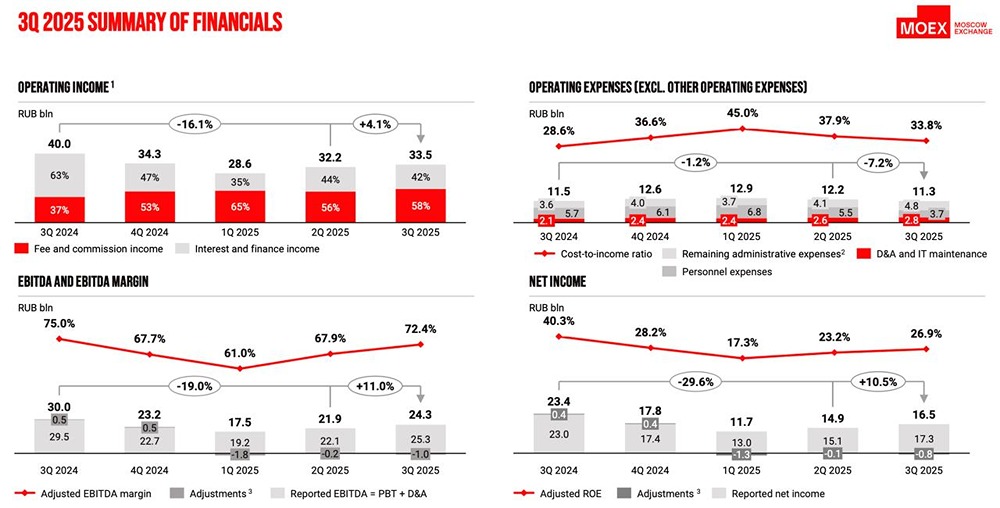 Мосбиржа: стоит ли обратить на нее внимание? На конец октября на Мосбирже насчитывалось 39,4 млн брокерских счетов, что говорит о росте интереса инвесторов к финансовым рынкам. Однако объемы торгов в основном связаны с долговым рынком. Давайте разберемся подробнее, изучив отчет компании за 9 месяцев 2025 года. Комиссионные доходы Мосбиржи выросли на 24,3% и достигли 55,8 млрд рублей. Комиссии остаются основой бизнеса компании, продолжая приносить значительный доход. Объемы торгов на всех рынках увеличились. За третий квартал оборот на долговом рынке вырос вдвое, достигнув 9,8 трлн рублей. Схожую динамику показали денежный, валютный и срочный рынки. В то же время объемы торгов акциями остались на уровне прошлого года. Процентные доходы, которые росли весь 2024 год, сейчас снижаются. За девять месяцев они упали на 38,1% и составили 45,4 млрд рублей. Это неудивительно, учитывая снижение ключевой ставки ЦБ и отток средств со счетов в финансовых организациях. Вероятно, в следующем году процентные доходы продолжат снижаться. Однако высокая база 2024 года позволит избежать резкого падения доходов в 2025 году. Мосбирже удалось справиться с увеличением расходов на персонал. Расходы на зарплаты снизились на 15,7%, но общие и административные издержки выросли на 37,7%. В результате чистая прибыль упала на 27% и составила 45,2 млрд рублей. В итоге отчет за 9 месяцев 2025 года можно назвать умеренно негативным. Процентные доходы продолжат снижаться, что приведет к уменьшению чистой прибыли. Однако даже с учетом этого выручка и прибыль останутся выше докризисных уровней. При этом акции Мосбиржи выглядят недооцененными. P/E на текущий момент составляет 6,2, а P/B достиг 1,5. Мосбиржа вряд ли станет лучшей инвестиционной идеей на 2026 год, так как ее акции будут зависеть от геополитической и экономической ситуации в стране. Тем не менее, эта компания заслуживает внимания. Инвесторы могут рассчитывать на высокие дивиденды, близкие к двузначным значениям. Не является индивидуальной инвестиционной рекомендацией Пост взят с соцсети [M O N D I A R A](https://i.mondiara.com/) 👉 вот ссылка на канал: https://i.mondiara.com/i/c/mosbirzha_analytics Скачать в [App Store](https://apps.apple.com/ru/app/m-o-n-d-i-a-r-a/id6475953453) Скачать в [Google Play](https://play.google.com/store/apps/details?id=com.mondiara.app) Валюта расчёта - Ваши добрые мысли! Спасибо, что с нами! Источник: ИнвестТема | Литвинов Владимир