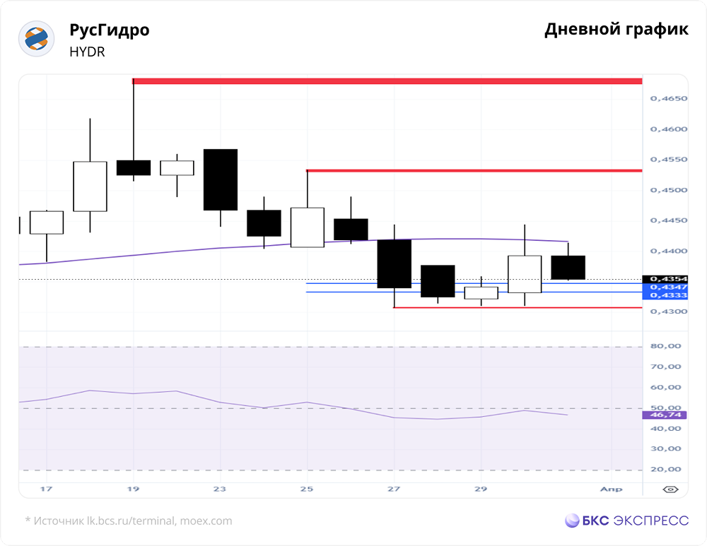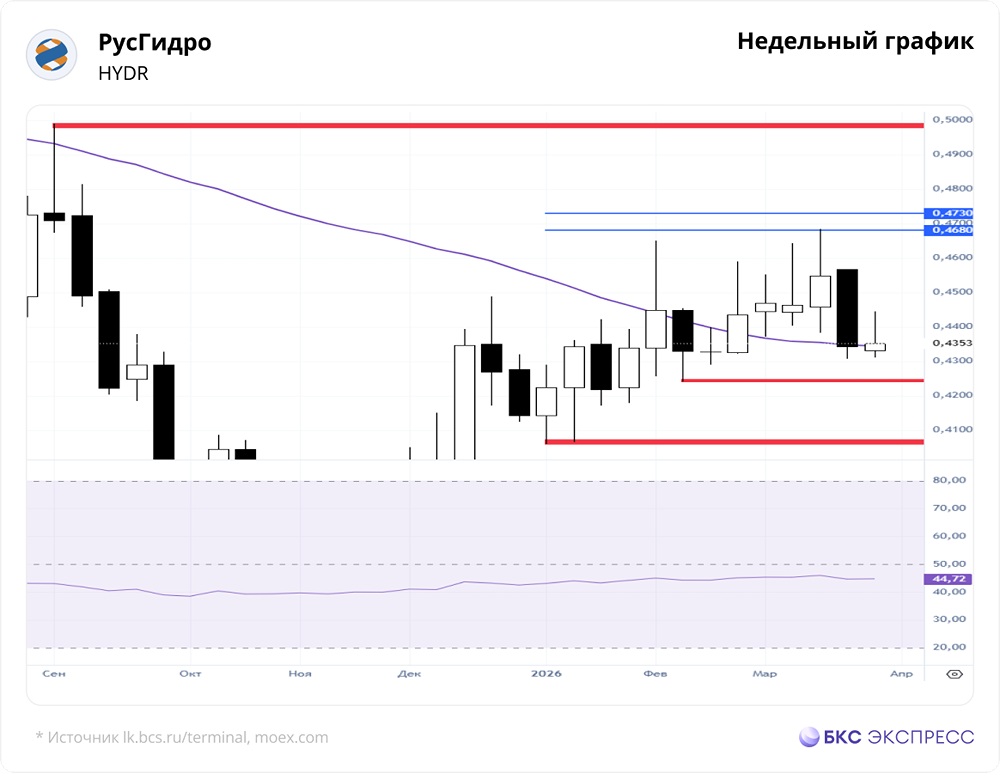 📣 Мнение БКС Экспресс. На прошлой торговой сессии акции «РусГидро» выросли на 1,17%, закрывшись на уровне 0,4393 руб. Они показали лучшие результаты, чем рынок в целом, при объеме торгов 74 млн руб. Краткосрочная картина • Во второй половине марта акции достигли уровня 0,468–0,473 из долгосрочной перспективы. Максимум был установлен на отметке 0,4684, после чего начался откат. • На дневном графике акции упали в область 0,4347–0,4333. Сопротивление на уровне 0,4534 пока не пробито, и контроль остается за продавцами. • Для возобновления роста необходим пробой отметки 0,4534. В этом случае покупатели продолжат движение к следующим целям из долгосрочной перспективы. • Индекс относительной силы (RSI) на дневном графике находится на уровне 46 п., а на 4-часовом — ниже 50- и 200-дневной скользящих средних. Ключевые уровни сопротивления и поддержки: 0,4534 и 0,424. Внешний фон Индекс S&P 500 в понедельник снизился на 0,37%, начав день в плюсе на 0,6%. Индексы Азиатско-Тихоокеанского региона (АТР) торгуются в минусе. Нефть Brent выросла на 0,19% в понедельник и на 0,5% утром. ❗️ Сопротивления: 0,4444, 0,4534, 0,4684 ❗️ Поддержки: 0,4403, 0,424, 0,4065 Долгосрочная картина • На недельном графике структура указывает на цели роста 0,468–0,473. Цена достигла первой цели на уровне 0,468. • Пока поддержка на уровне 0,424 не сломана, контроль остается за покупателями, и сценарий восходящего тренда остается актуальным. • Важно следить за закрытием недельной свечи в конце торгов пятницы. Финансовые результаты Компания «РусГидро» опубликовала финансовую отчетность по МСФО за 2025 год: • Выручка: 741,3 млрд руб. (+15,3% г/г) • EBITDA: 219,7 млрд руб. (+45,7% г/г) • Чистая прибыль: 117,9 млрд руб. (в 2024 году был убыток) Результаты за IV квартал 2025 года и за весь год хорошие. Рост субсидий в IV квартале позволил увеличить скорректированный показатель EBITDA до 214 млрд руб. В IV квартале EBITDA выросла на 90% г/г. Однако инвестиции значительно увеличились, и свободный денежный поток остался отрицательным за квартал и за год. Долг вырос на 83 млрд руб. до 706 млрд руб. Когда инвестиции сократятся и компания вернется к положительному свободному денежному потоку, это может позволить возобновить выплату дивидендов (хотя мы не ожидаем их в 2026 и, вероятно, в 2027 годах) и начать снижать долг. 🔥 Аналитики БКС имеют «негативный» взгляд на акции «РусГидро». Целевая цена на горизонте года составляет 0,35 руб. за акцию. Автор: Мамонтов Андрей Не является индивидуальной инвестиционной рекомендацией Источник: bcs-express.ru