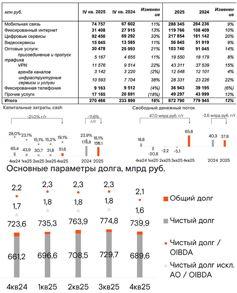 Вышел отчет за 2025 год у компании «Ростелеком». Цифры за 4 квартал прям порадовали, правда, долг перечеркивает позитив, но обо всем по порядку! 📌 Что в отчете — Выручка. Выросла на 12% до 872 млрд, но в 4 квартале случился мощный рывок с ростом на 16% до 271 млрд рублей. Если посмотреть детально, то рост на 33% до 92 млрд рублей в цифровых сервисах связан с развитием Госуслуг, с продвижением сервисов информационной безопасности, услуг дата-центров и облачных сервисов. Рост на 21% в оптовых услугах связан с ростом спроса на VPN-сервисы и увеличением продаж инфраструктурных сервисов до 30 млрд рублей. Смешно, что из-за массовых блокировок «Ростелеком» стал больше зарабатывать на VPN-сервисах! — Операционная прибыль. Выросла на 20% до 149 млрд рублей (в четвертом квартале аж на 36%). Магия связана с отсутствием роста по второй статье расходов — амортизации (рост на 5 млрд рублей до 178 млрд)! — Долг и FCF. А вот тут начинается жара! Из 149 млрд операционной прибыли компания отдала на 115 млрд нетто финансовых расходов — доля 77%. Год назад 79 из 124 млрд рублей — доля 63%. У компании огромный чистый долг в 690 млрд рублей, который снизился в 4 квартале из-за сильного FCF в 65 млрд рублей (год к году падение с 40 до 37 млрд рублей), который был достигнут из-за сокращения Capex год к году с 65 до 51 млрд рублей (за год падение с 179 до 158 млрд рублей) и поступлениями по контрактам в конце года! Компания является бенефициаром снижения ключевой ставки, так как 45% долга является плавающим, что кратно улучшит прибыль в 2026 году! 📌 Мнение по «Ростелекому» Сильный 4 квартал по всем показателям: от роста выручки и операционной прибыли до высвобождения FCF для нормализации NET DEBT, но вот только по итогам года акционеры компании получили прибыль в 11 млрд рублей (6 млрд рублей относятся к неконтролирующим акционерам), что дает P/E = 22! Считаю, что если компания урезает Capex (в будущем придется нарастить), то нужно также урезать дивиденды по итогам 2025 года! Компания является бенефициаром снижения ставки, что потенциально позволит сделать X3 по прибыли для акционеров, только даже в таком сценарии форвардный P/E за 2026 год = 7 не возбуждает! Вывод: огромный долг нивелирует сильные операционные результаты за 4 квартал, дешевизны нет даже при утроении прибыли в 2026 году. ⚡️ Субъективная позиция — Наблюдать! Не является индивидуальной инвестиционной рекомендацией Пост взят с международного финтех-медиа ресурса [M O N D I A R A](https://mondiara.com) [Скачать](https://apps.apple.com/ru/app/m-o-n-d-i-a-r-a/id6475953453) приложение в App Store [Скачать](https://play.google.com/store/apps/details?id=com.mondiara.app) приложение в Google Play Источник: Invest_Palych