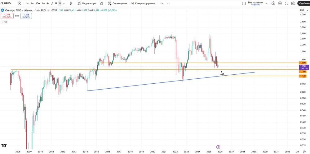 На графике видно, что "Юнипро" приближается к уровню поддержки 1,3. Если актив пробьёт этот уровень, можно ожидать его падения до 1,13-1,1, а возможно, и до круглого уровня 1.