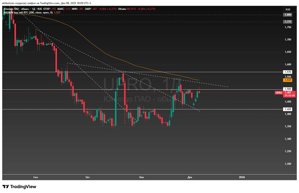 Как влияют новости из США на акции Юнипро? Акции компании Юнипро показали рост, сопоставимый с рынком, после небольшой коррекции. Основной причиной стала обновленная Стратегия национальной безопасности США, которая подчеркивает важность быстрого завершения украинского конфликта. На недельном графике сформировался бычий пинбар. Котировки остаются выше нисходящего тренда от февраля 2025 года. Они нашли поддержку на уровне 1,42 руб., а сопротивление — на 1,5 руб. По мере отскока от поддержки объемы торгов растут, что является умеренно позитивным сигналом. Что может произойти? 1. При успешном закреплении выше уровня 1,5 руб. акции Юнипро могут продолжить рост и достичь 200-дневной скользящей средней в районе 1,57 руб. Позитивные новости о геополитической деэскалации могут ускорить этот процесс. 2. Если новых позитивных сигналов не будет или акции не смогут закрепиться выше 1,5 руб., восходящее движение может приостановиться. Это приведет к консолидации или даже снижению котировок. Вывод: Хотя есть позитивные технические сигналы, дальнейший рост акций Юнипро не гарантирован. Он зависит от геополитической ситуации и способности компании преодолеть уровень 1,5 руб. Не является индивидуальной инвестиционной рекомендацией Пост взят с соцсети [M O N D I A R A](https://i.mondiara.com/) 👉 вот ссылка на канал: https://i.mondiara.com/i/c/unipro_analytics Скачать в [App Store](https://apps.apple.com/ru/app/m-o-n-d-i-a-r-a/id6475953453) Скачать в [Google Play](https://play.google.com/store/apps/details?id=com.mondiara.app) Валюта расчёта - Ваши добрые мысли! Спасибо, что с нами! Источник: Romanov | Анализ рынка