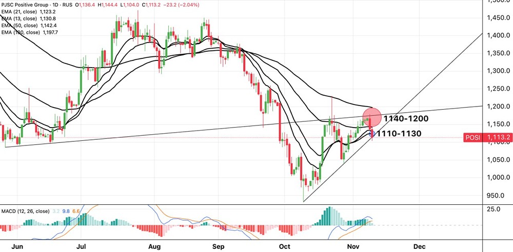 Акции «Позитива» уходят ниже всех поддержек-ЕМА, но при этом все еще удерживается поддержка в виде локальной трендовой актива — диапазон ₽1110–1130.